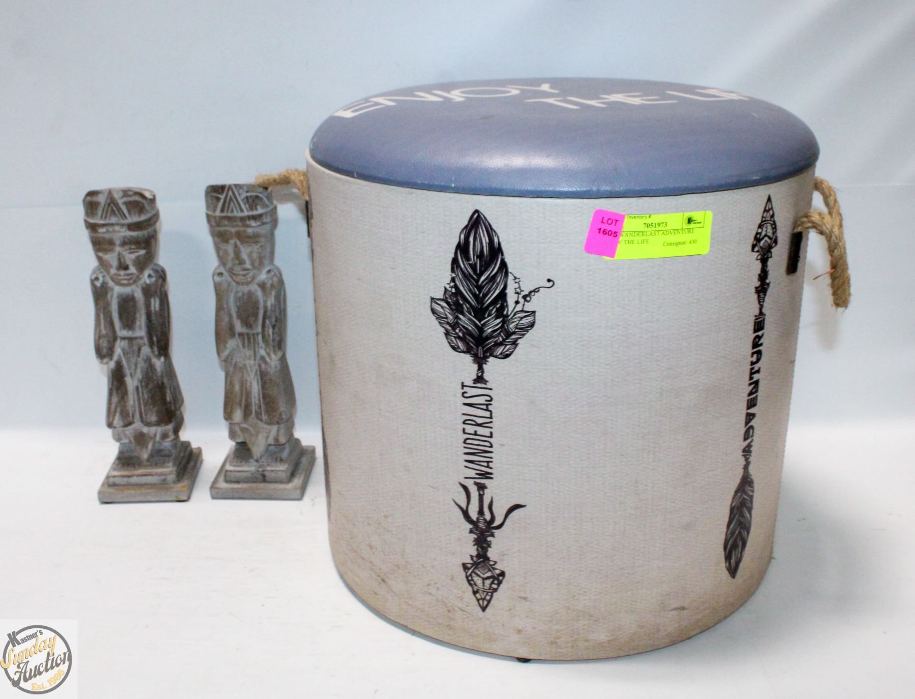 STORAGE STOOL SOLD WITH TWO DECORATIVE FIGURES **ALL ITEMS MUST BE REMOVED BY 5PM SATURDAY, SEPTEMBER 6TH 2025. ALL REMAINING ITEMS WILL BE SUBJECT TO A $6.00 PER DAY STORAGE CHARGE. ANY ITEMS REMAINING AFTER MONDAY, SEPTEMBER 22ND 2025 WILL BE CONSIDERED FORFEITED. NO REFUNDS WILL BE ISSUED FOR FORFEITED ITEMS. TO SCHEDULE A PICK UP APPOINTMENT CLICK HERE