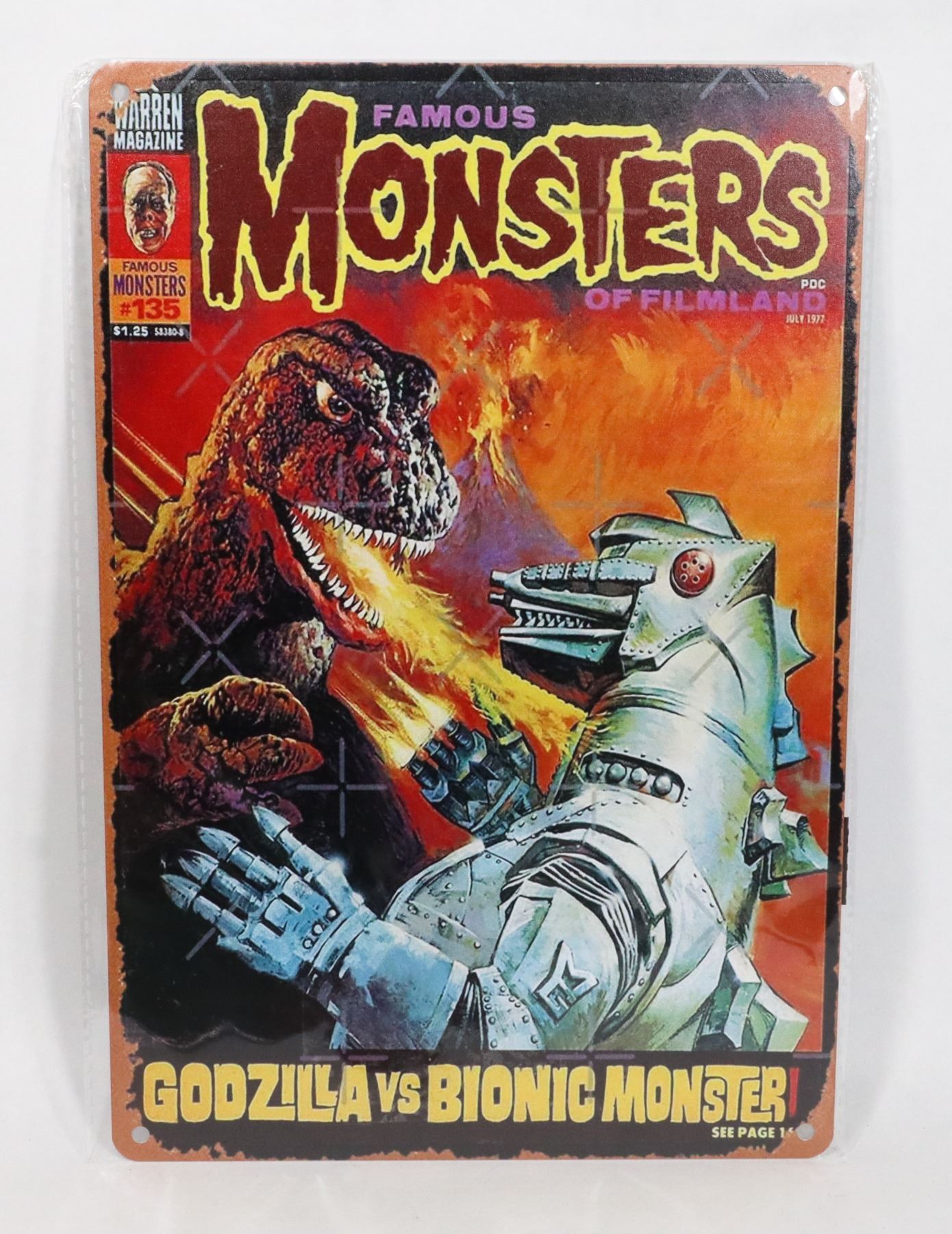 MONSTERS GODZILLA VS BIONIC MONSTER METAL SIGN. APPROX. 12"X8". PRE-DRILLED HOLES FOR HANGING