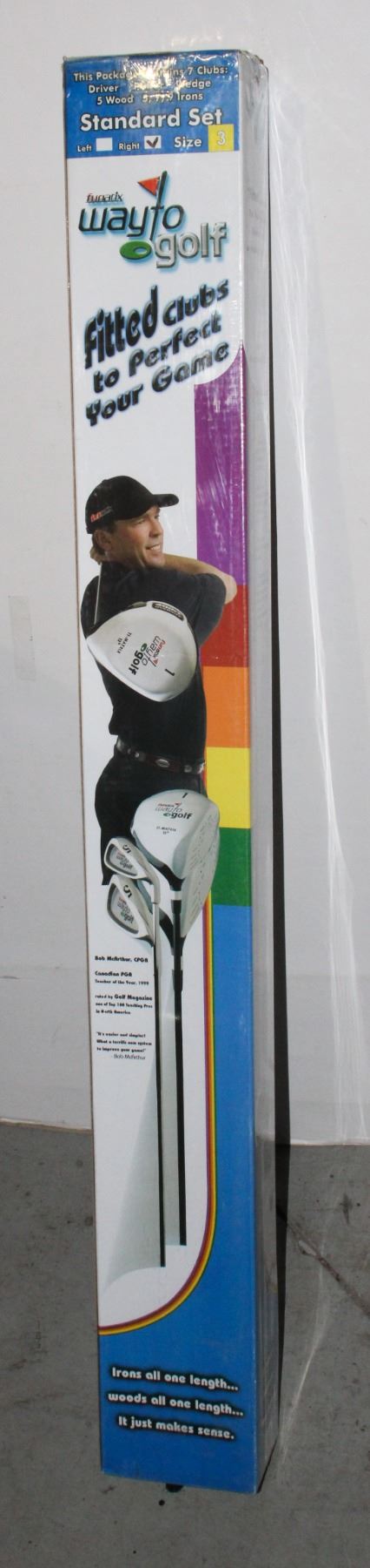 SIZE 5. SET INCLUDES DRIVER, PUTTER, WEDGE, 5 WOOD, 5 IRON, 7 IRON, AND 9 IRON. SET IS SIZE 3