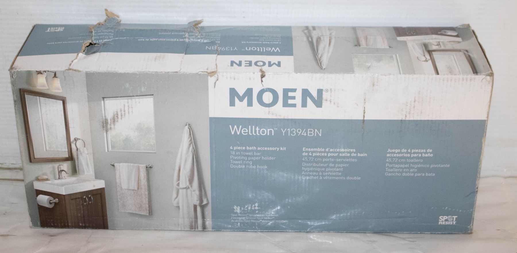ACCESSORY KIT, WELLTON 4-PIECE BATHROOM ACCESSORY KIT, BRUSHED NICKEL. SPOT RESIST BRUSHED NICKEL FINISH RESISTS FINGERPRINTS AND WATER SPOTS FOR A CLEANER LOOKING BATH PIVOTING PAPER HOLDER; TOWEL BAR; DOUBLE ROBE HOOK; TOWEL RING