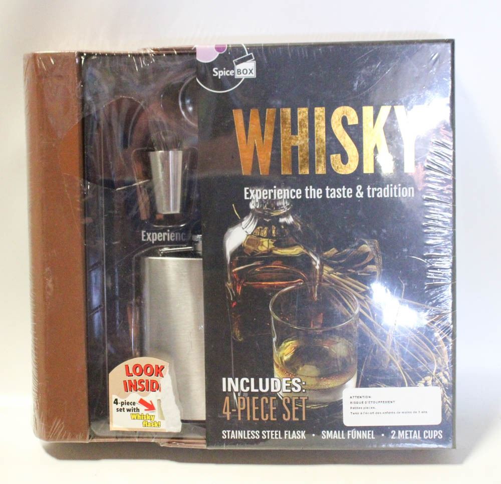 NEW WHISKEY BOX-FLASK, 2 METAL CUPS + FUNNEL