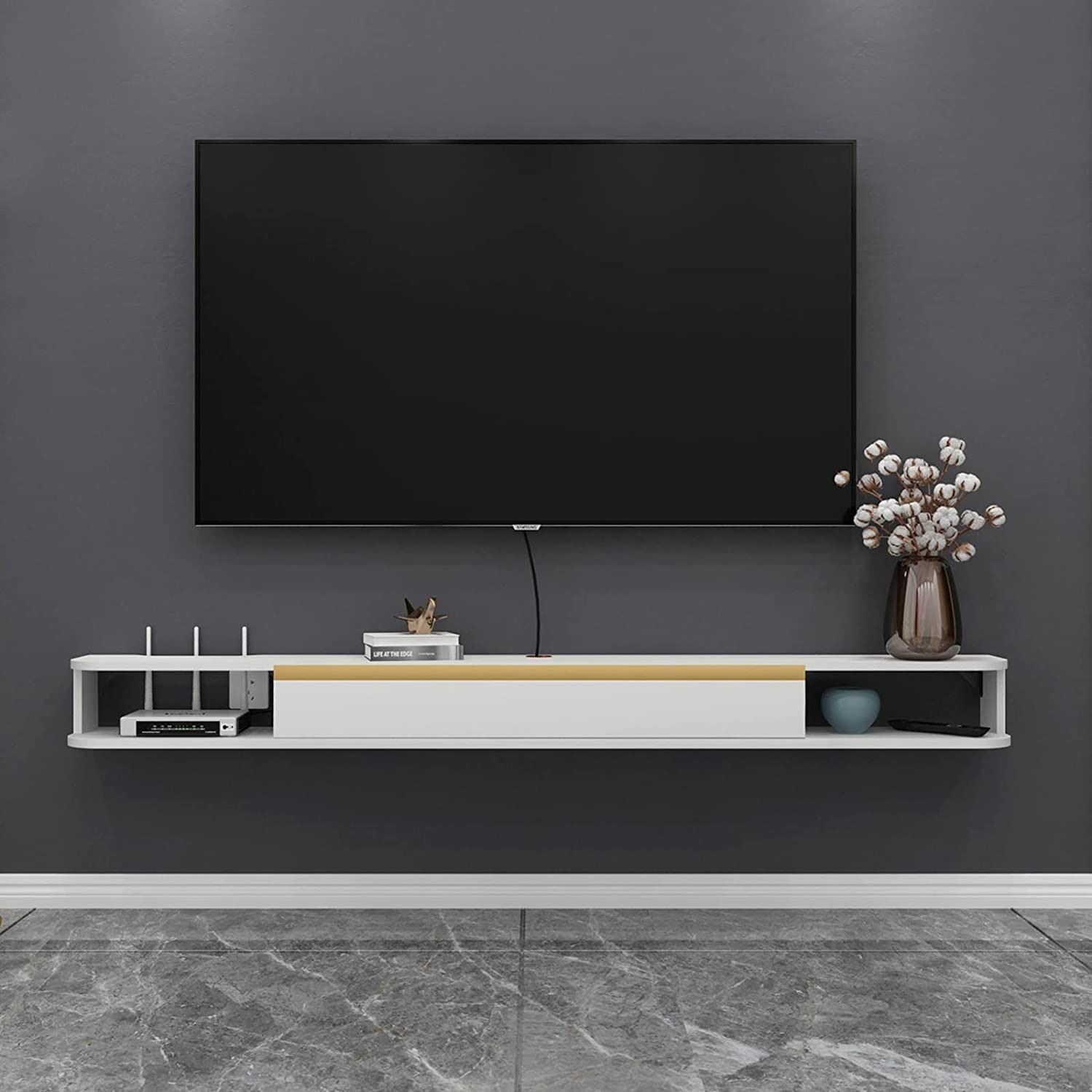 ALL PARTS CHECKED, HARDWARE CHECKED AND CONFIRMED, MULTIPLE MOUNTING OPTIONS AND SURFACES, FRONT OPENING COMPARTMENT WITH GOLD TONE ACCENT, WHITE/GREY MAIN COLOUR, ASSEMBLY REQUIRED, INSTRUCTION MANUAL INCLUDED, AMZ SES
