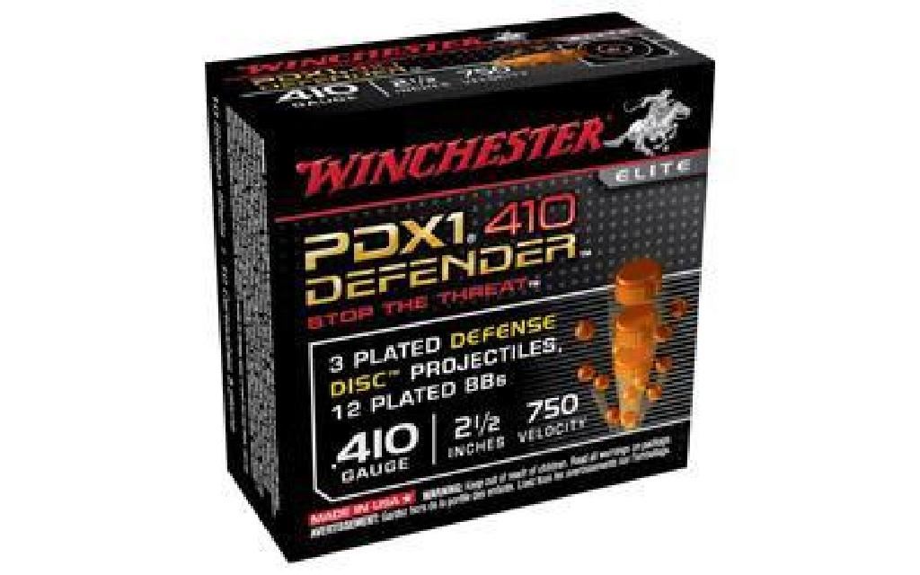 Mfr Items:Winchester Ammo Category:SHOTSHELL LEAD LOADS Gauge:410 Gauge Type:Personal Defense Length:2.5" Shot Size:3 Defense Discs/12 BBs Muzzle Velocity:750 fps Rounds Per Box:10 Boxes Per Case:10 Application:Home Defense/Hunting Hull Material:Plastic Gauge:410 Gauge Type:Personal Defense Length:2.5" Shot Size:3 Defense Discs/12 BBs Muzzle Velocity:750 fps Rounds Per Box:10 Application:Home Defense/Hunting Hull Material:Plastic