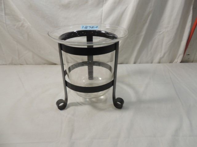 LIKE NEW GLASS INSERT WINE BOTTLE CHILLER, VASE, ETC. GLASS IN METAL BASE AS SHOWN. 10.5" TALL AND 10" IN DIAMETER.