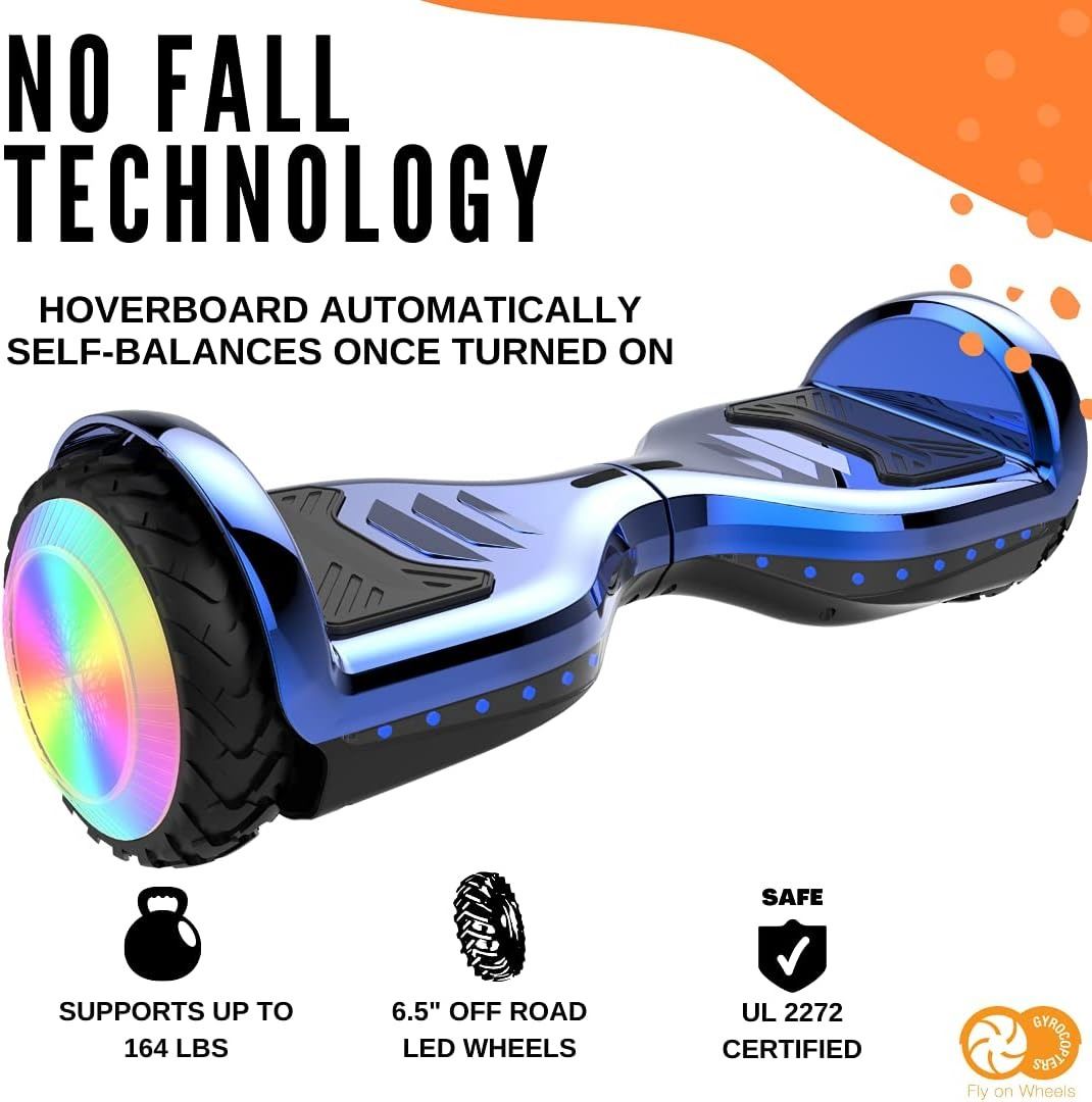 HOVERBOARD, 6.5" LED WHEELS, UL2272 SAFETY CERIFIED, UP TO 15KM/H, 250W POWERFUL MOTOR, NO FALL TECHNOLOGY, LONG BATTERY LIFE, BUILT IN BLUETOOTH SPEAKER, CHROME BLUE, AMZ SES **ALL ITEMS MUST BE REMOVED BY 5PM SATURDAY, SEPTEMBER 2ND 2024. ALL REMAINING ITEMS WILL BE SUBJECT TO A $6.00 PER DAY STORAGE CHARGE. ANY ITEMS REMAINING AFTER MONDAY, NOVEMBER 18TH 2024 WILL BE CONSIDERED FORFEITED. NO REFUNDS WILL BE ISSUED FOR FORFEITED ITEMS. TO SCHEDULE A PICK UP APPOINTMENT CLICK HERE