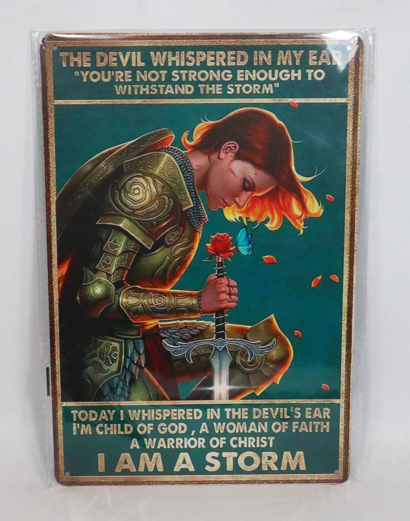 WHISPERED IN MY EAR YOU'RE NOT STRONG ENOUGH TO WITHSTAND THE STORM. TODAY I WHISPERED IN THE DEVIL'S EAR. I'M A CHILD OF GOD, A WOMAN OF FAITH A WARRIOR OF CHRIST I AM THE STORM. APPROX. 12"X8" PRE-DRILLED HOLE FOR HANGING