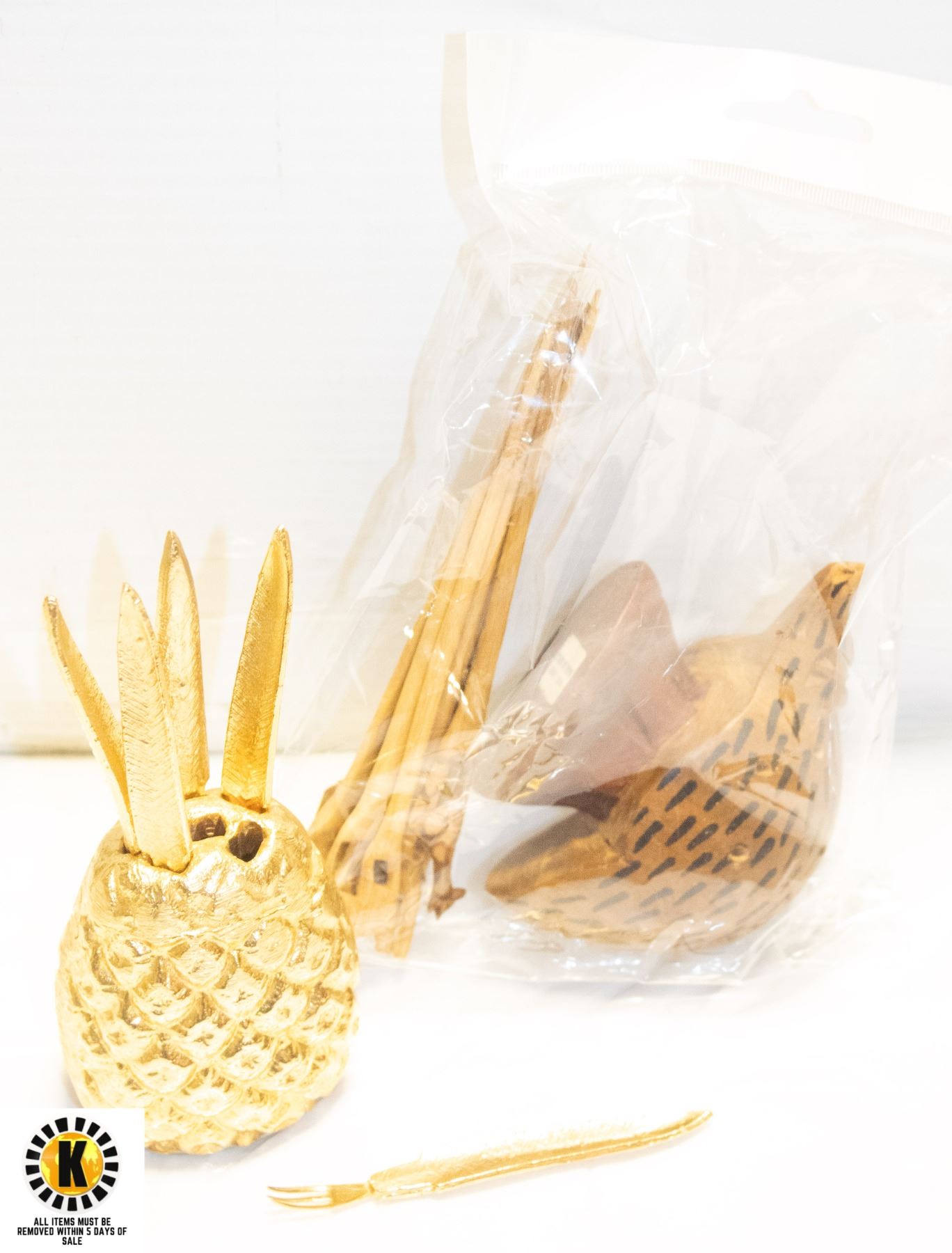 ANIMAL THEMED PICKS, HAND-CARVED, TAG-MADE IN KENYA AND VTG 1960'S PINEAPPLE APPETIZER FORK SET