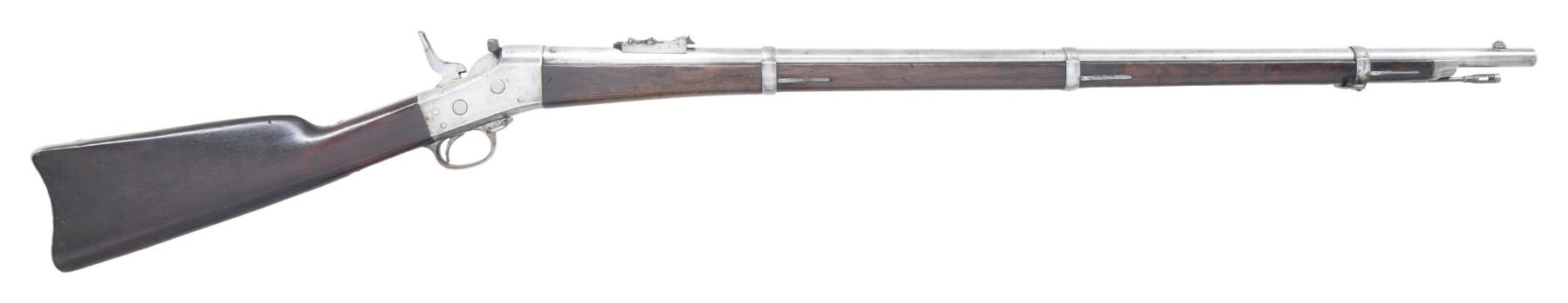 RIFLE. Cal. 50-70. NSN. Bbl. 36". After the conclusion of the U.S. Civil War, the U.S. government, in search of a new metallic cartridge rifle, chose Springfield's trapdoor design. The state of New York chose to adopt Remington's Rolling Block rifle, subsequently placing a contract for 15,000 rifles circa. 1871, with some sources noting another contract for an additional 4,500 rifles in 1863. The distinctive New York contract rifles feature a very high curved hammer and thumb lever that protrudes to the right instead of up. Upper receiver tang shows standard Remington mfg. and patent markings. Left side of bbl. and bbl. bands are stamped "B". Top of buttstock is marked with a faint raised "C/ 28", with "RBH" stamped within a banner on the left side at the wrist. 3-band fastened forearm and straight grip buttstock, with iron buttplate. Fixed blade front sight, with U-notch ladder rear sight. Iron slotted tip cleaning rod. CONDITION: metal components have been cleaned and are in-the-white, showing a mostly bright appereance with scattered spots of age related discoloration and spots/areas of light to mild pitting overall. Very bright bore, exhibiting scattered areas of light to mild pitting. Wood furniture shows scattered marks and impressions from handling and storage, but otherwise remains sturdy and serviceable. (01-27030/MLW). ANTIQUE. $1,000-1,500.