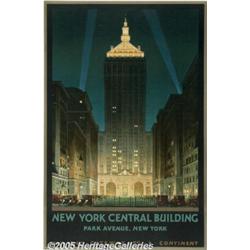 <B>New York Central Building (Latham Litho and PTG. Co., Long Island, NY, 1930)</B></I> Architectural Poster (27" X 41"). The view is looking down Park Avenue in 1930 towards the New York Central Building which towers above Grand Central Terminal (Grand Central Station is the Post Office down the street.) Strangely enough, if you were to recreate this view today, the building would look much the same because it has been restored and relit to look almost identical to the image on the poster. The only major difference would be the looming skyscraper behind it, which was originally called The Pan Am building and is now called by whatever name somebody was willing to pay for. The poster's artist, Chesley Bonstell (1888-1986) started his career as an architectural illustrator, which is why he received the commission to do this poster and several other of buildings in other cities associated with the New York Central line. Bonstell moved away from this kind of work to become perhaps the preeminent illustrator of interplanetary themes. His paintings of the planets decorated the lobby of the New York Planetarium and graced the cover of many science fiction magazines. Using spectrograhic analysis, he attempted to create the color schemes on the surface of the planets in the solar system. When one of the probes landed on a far distant planet and sent pictures back to earth, one of the first messages flashed across the system was: "Tell Bonstell He Was Right." Very Fine+ condition on Linen.