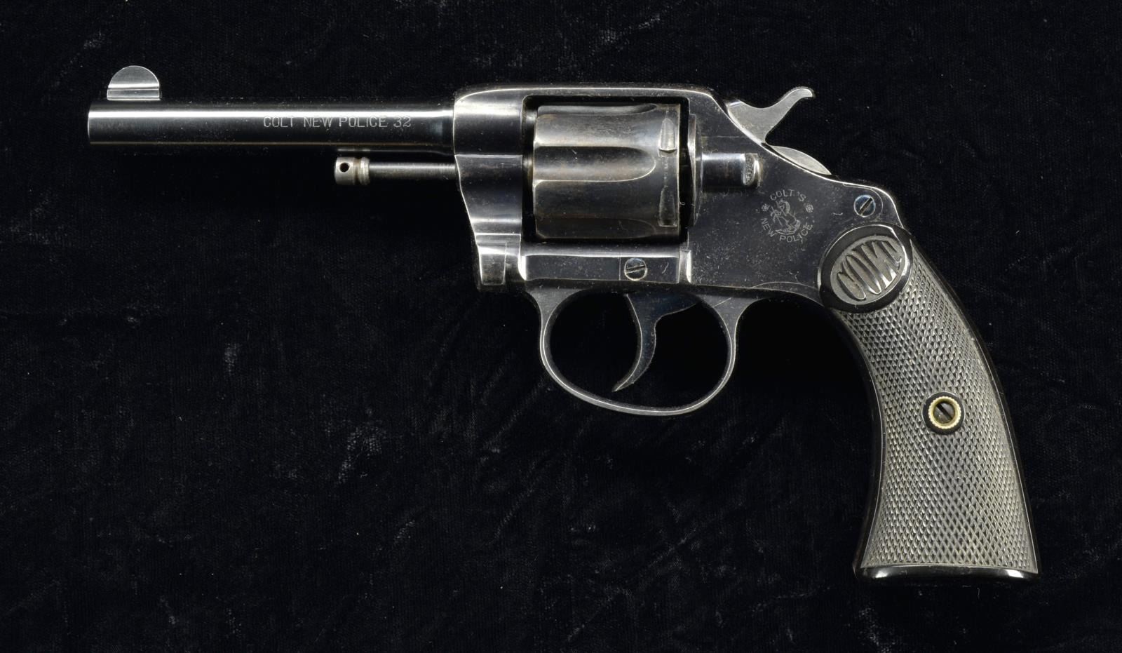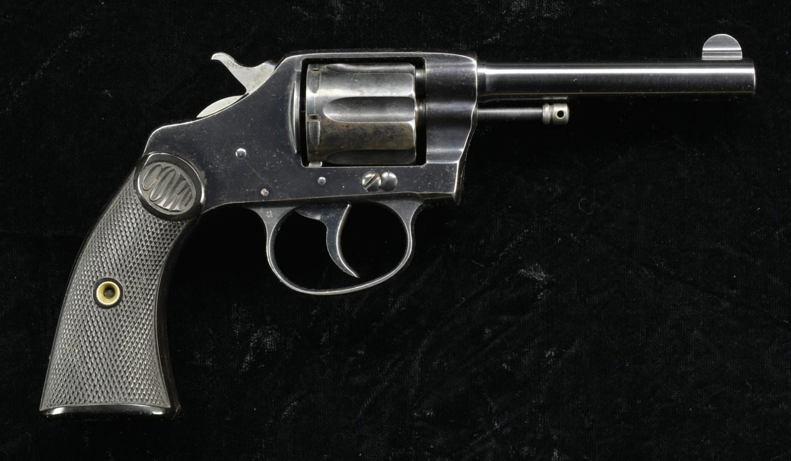 DA REVOLVER. Cal. 32 Police (32 Colt New Police). S# 2621 (1898, 1st year of production). In 1896, Commissioner of the Police Department of New York City, Theodore Roosevelt, adopted this revolver as standard issue. The back strap is engraved "New York Police" & butt has # "3035". Left side trigger guard has "star" as possible factory rework mark; later replacement 4" bbl. w/ fixed sight & 1905 patent date. High polish blue finished revolver w/ 6 shot fluted cyl., fire blued trigger & some screws. Matching numbered 2 piece hard rubber Colt grips. CONDITION: very good frame blue as factory quality refinish. Very good replacement bbl. blue. Cyl. has good blue w/ cyl. turn line, wear, oxidation & patina. Very good grips. Very good bore. (01-21070/MD). ANTIQUE. $200-400.