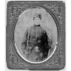 <b>119A. NEW YORK STATE PRIVATE </b>A great 1/6th plate tintype of a New York state private with lightly tinted cheeks, wearing a nine-button frock coat, N.Y.S. belt buckle, belt with cap box, and holding at his side a bayoneted rifle. The young soldier stands in front of a patriotic backdrop with an American flag flying in the background. With brass preserver but no case. Minor spotting, else overall very good.<b> $300-400</b>