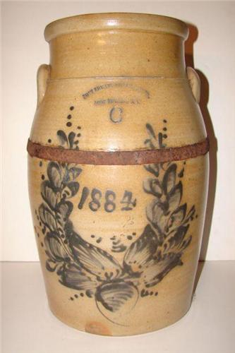 NEW YORK BLUE DECORATED STONEWARE BUTTER CHURN. 6 gallons. Eared handles. Elaborated cobalt blue slip decorated wreath motif around text that reads “1884”. Stamped at top of body “Fort Edward Stone Ware Co./Fort Edward, N.Y./6”. Crock has iron band around top of body. Shows one large area of loss at top. Shows one tight vertical hairline crack at side above handle and tight spider cracking at the other side below handle. 17.5” H