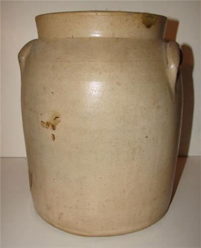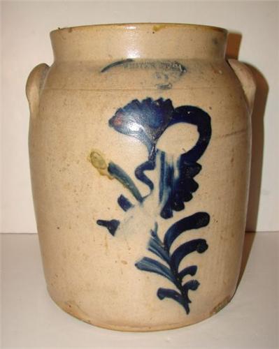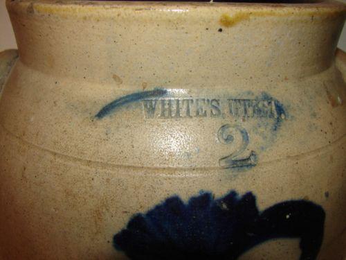 NEW YORK BLUE DECORATED STONEWARE CROCK. 2 gallons. Eared handles. Stamped at top of body “White’s Utica/2”. Cobalt blue brush decorated floral design at front of body. Incised line decoration at top of body. Blue design shows some loss. Shows two chips at outer portion of top rim. Shows two areas of spider cracking at bottom of body. 11.25” L