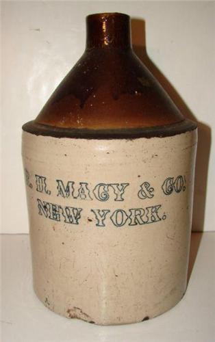 NEW YORK BROWN & WHITE STONEWARE JUG. Cobalt blue text on body reads “R.H. Macy & Co./New York”. Shows three chips along edge of base. Shows crazing throughout. 11.5” H