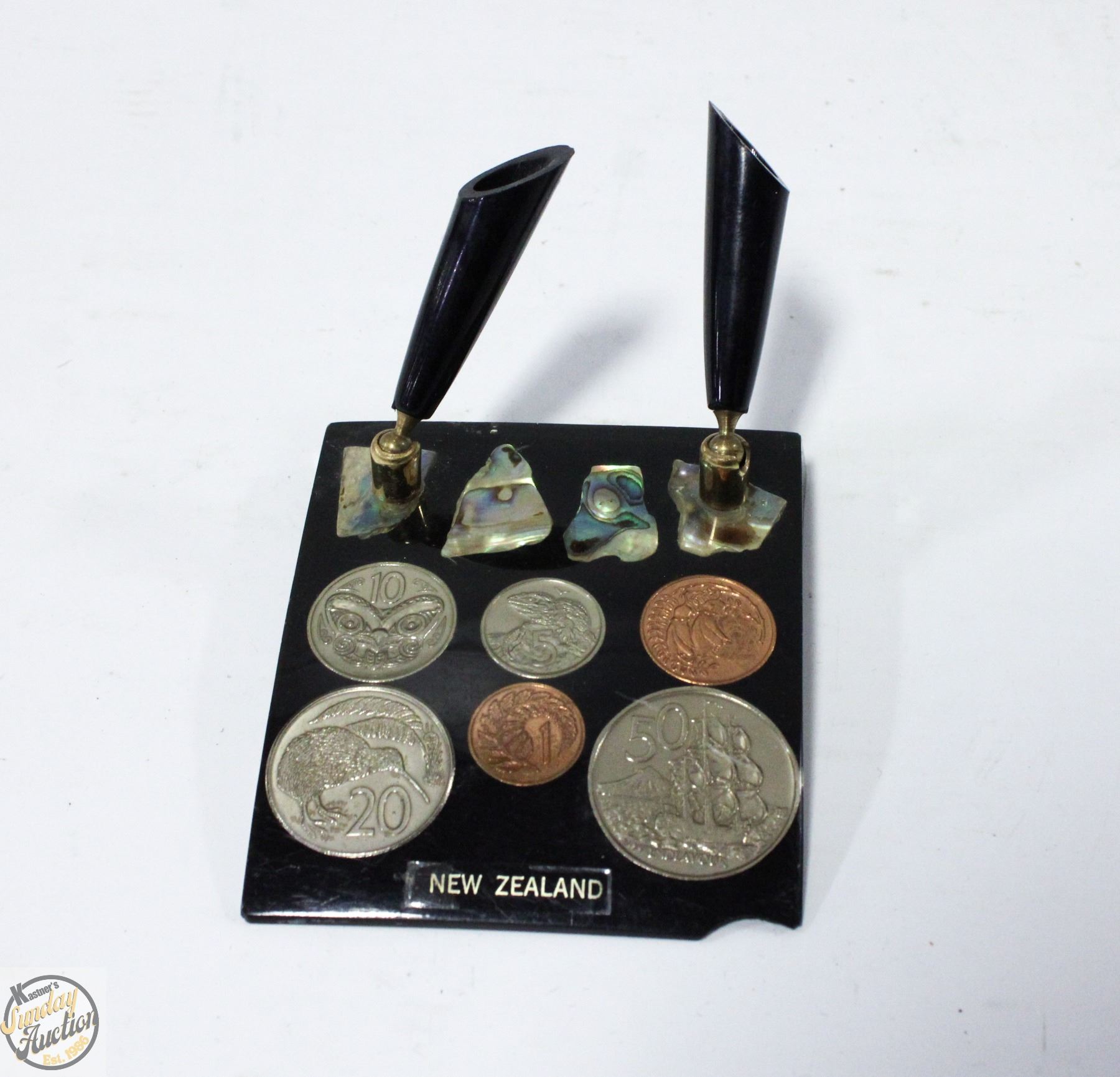 NEW ZEALAND ABALONE 6 PIECE COIN SET PEN HOLDER