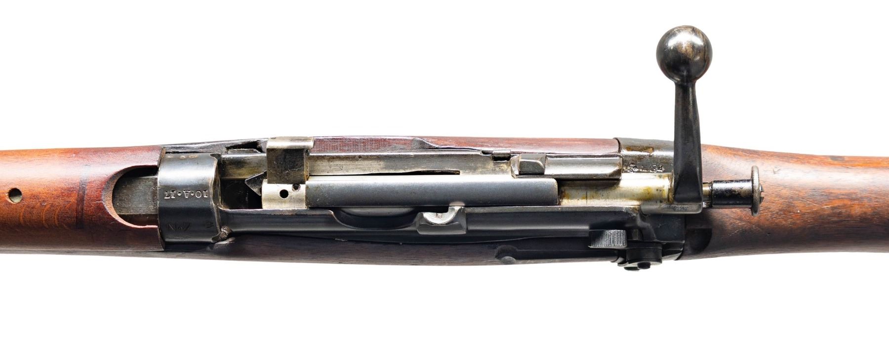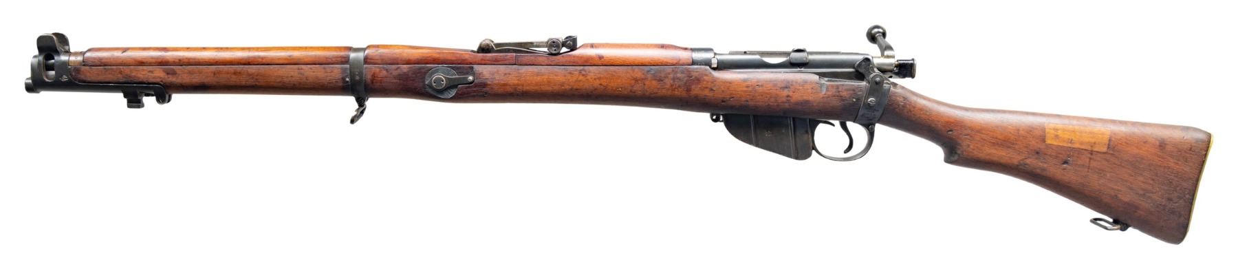 Cal. 22 LR. S# 923. Bbl. 25 1/5". Blade front sight with protective ears. Tangent rear sight graduated to 2000yds that moves freely. Front volley sight present but no rear volley sight present. All visible matching numbers with parts appearing arsenal force matched. SMLE converted to 22 LR for training purposes. Right side of socket has Enfield & "SHT '2 IV EFD" markings with 1901 date. Left side of socket has Enfield, SHTL & canceled Cond. IV markings with 1905 date. Receiver ring has "NZ" New Zealand & "10.A.17" markings. Left side of receiver has an added hole behind ring but there are no visible drill purpose markings. Arsenal rework blued finish. Hardwood stock set with bottom mounted sling swivels. Butt has a lighter appearance than rest of stock & has disc that is marked "N (Broad Arrow) Z/5/22/1129". MAGS: 1-10 rd. empty without internals. CONDITION: stock appears sanded with some black staining, a few armorer repairs, a thin crack on handguard ahead of rear sight, scattered dings & handling marks. Metal retains 50% arsenal rework blue with overall fading to gray, some dents in mag body, scattered oxidation & handling marks. Action functions properly when hand cycled. Good bore that is mostly bright with some light frosting. (25-2865/MJC). CURIO. $350-550.