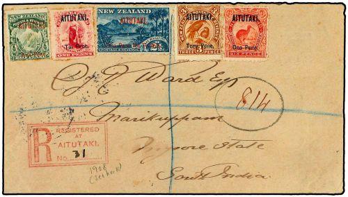 1908 Registered cover to MYSORE, India with uncancelled 1903 1/2 d., 1 d., 2 1/2 d., 3 d. and 6 d. (SG 1, 2, 4-6) with red registered AITUTAKI handstamp and AUCKLAND NEW ZEALAND and cds´s of receipt on reverse. Scarce cover.