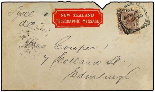 1890 NEW ZEALAND TELEGRAPHIC MESSAGE envelope bearing 6 d. cancelled by the AUCKLAND squeared circle, used to SCOTLAND. Scarce overseas usage.