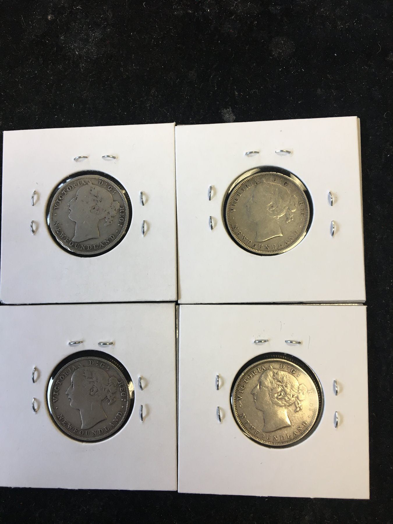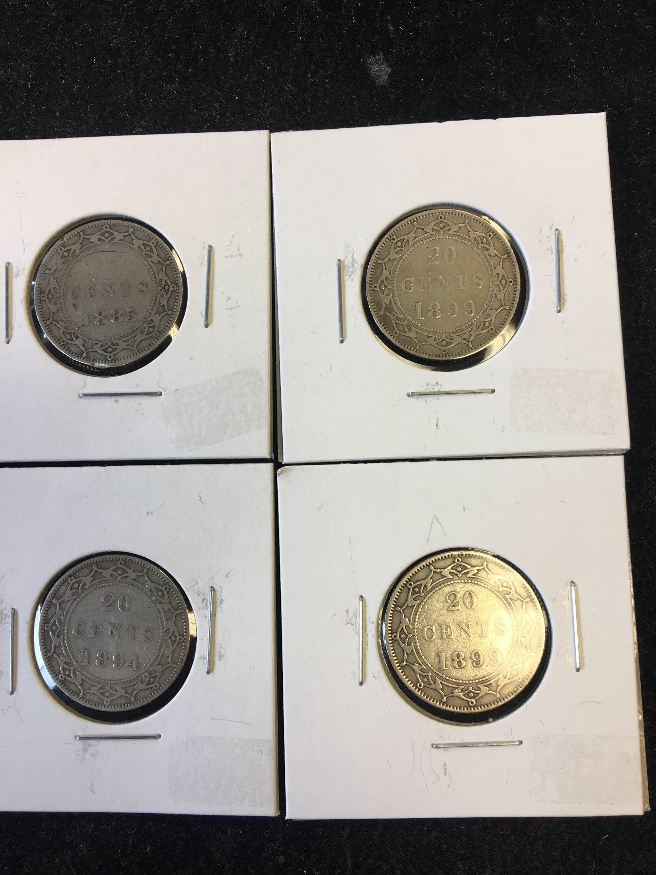 NICE OT OF 4 VICTORIA NEWFOUNDLAND 20 CENTS.1899X2,1885,1894..AVERAGE GRADE VG+