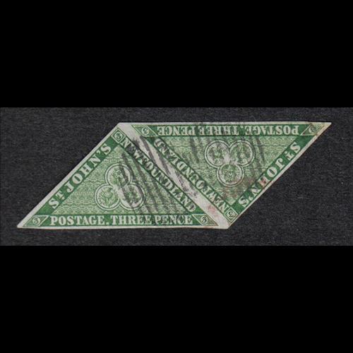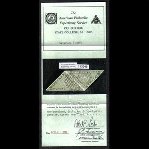 NEWFOUNDLAND #3 XF-USED IMPERF PAIR & CERT.