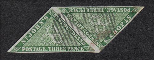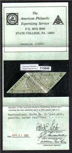 NEWFOUNDLAND #3 XF-USED IMPERF PAIR & CERT.