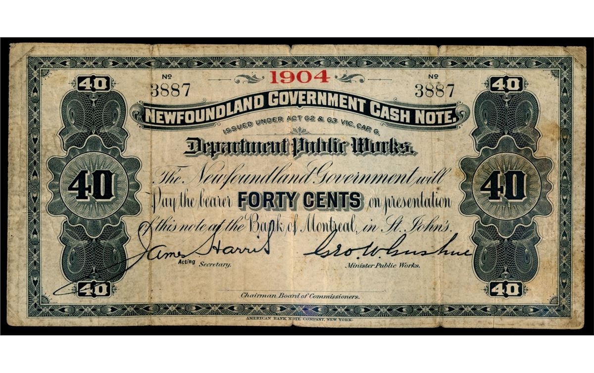 NEWFOUNDLAND GOVERNMENT CASH NOTE. 40 Cents. 1904. NF-2d. No. 3887. About Fine. Ex. MOORE's April 15, 2000 auction, Lot #007.