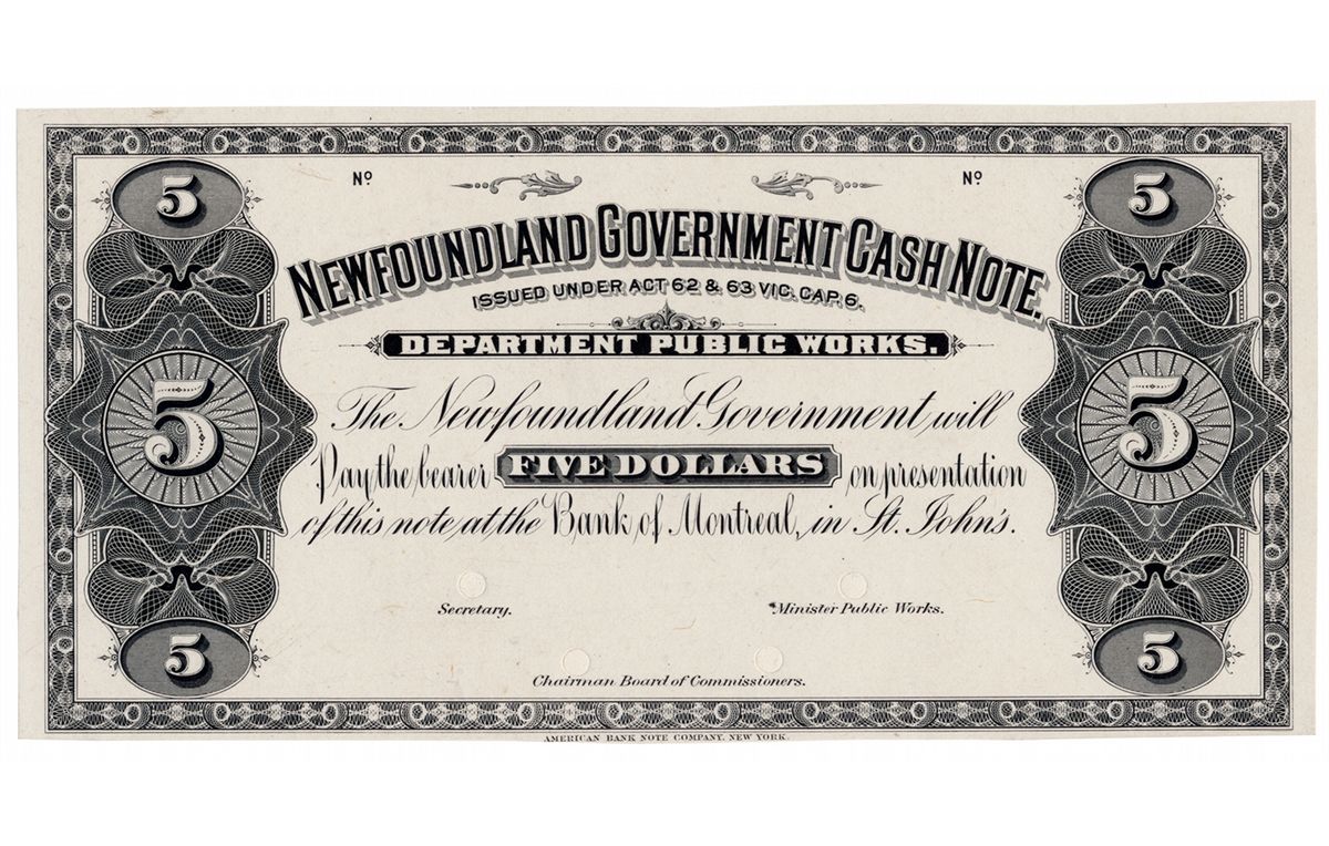 NEWFOUNDLAND GOVERNMENT CASH NOTE. $5.00. NF-6P. A Black and White Face Proof, on thick card. Unc. Ex. MOORE's Torex Auction, June 15-16, 2001. Lot #039.
