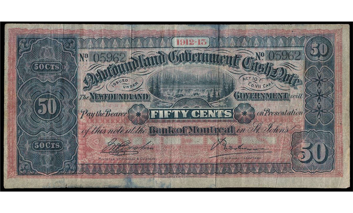 NEWFOUNDLAND GOVERNMENT CASH NOTE. 50 Cents. 1912-13. NF-8c. No. 05962. Very Good.