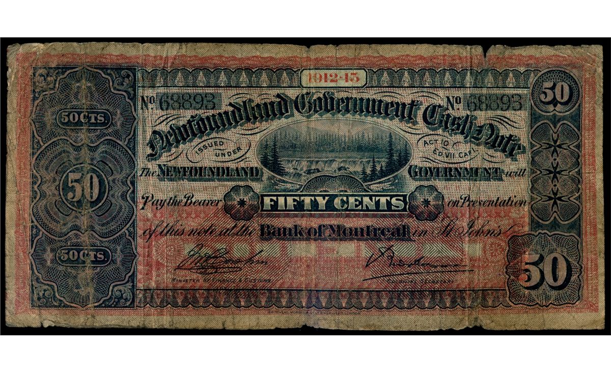 NEWFOUNDLAND GOVERNMENT CASH NOTE. 50 Cents. 1912-13. NF-8c. No. 68893. Good/Very Good. Some chips off edges; 50 Cents. 1913-14. NF-8d. No. 13977. Very Good+. Lot of two (2) notes.