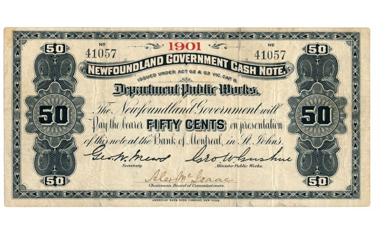 NEWFOUNDLAND GOVERNMENT CASH NOTE. 50 Cents. NF-3a. 1901. No. 41057. Fine. Ex. MOORE's Torex Auction, Feb. 22-23, 2002, Lot #006.