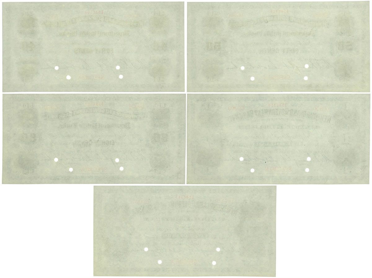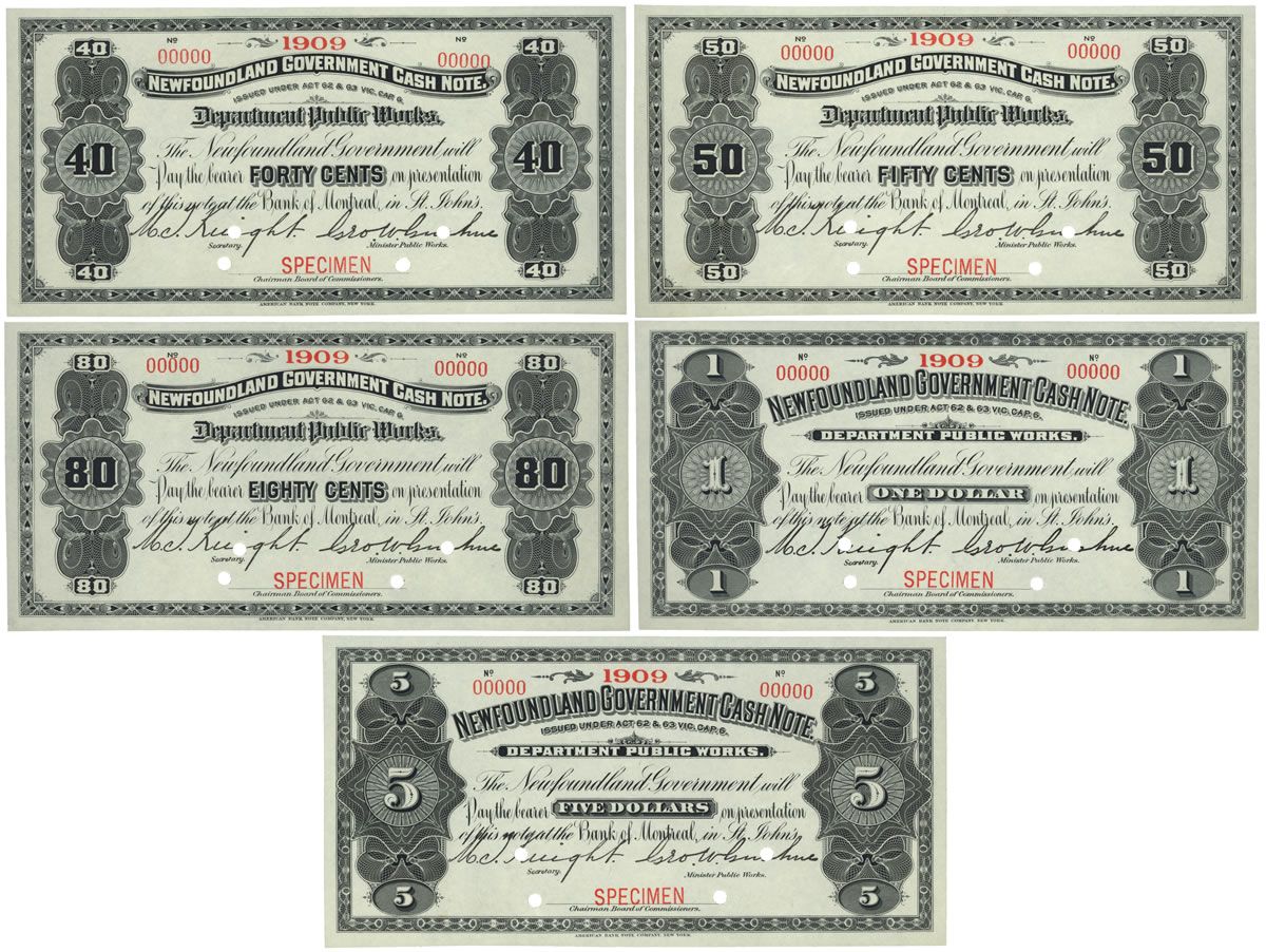 CASH NOTE. Complete 1909 Issue. Set of all five denominations NF-2s. 40cent, GUNC-66; NF-3s. 50 cent, GUNC-66; NF-4s. 80 cent, GUNC-66, NF-5s. $1.00, GUNC-65; NF-6s. $5.00, GUNC-64. SPECIMEN No. 00000. This is likely the highest quality 1909 set ever assembled. All of the notes are graded by PMG with EPQ designation. Lot of five (5) specimens.