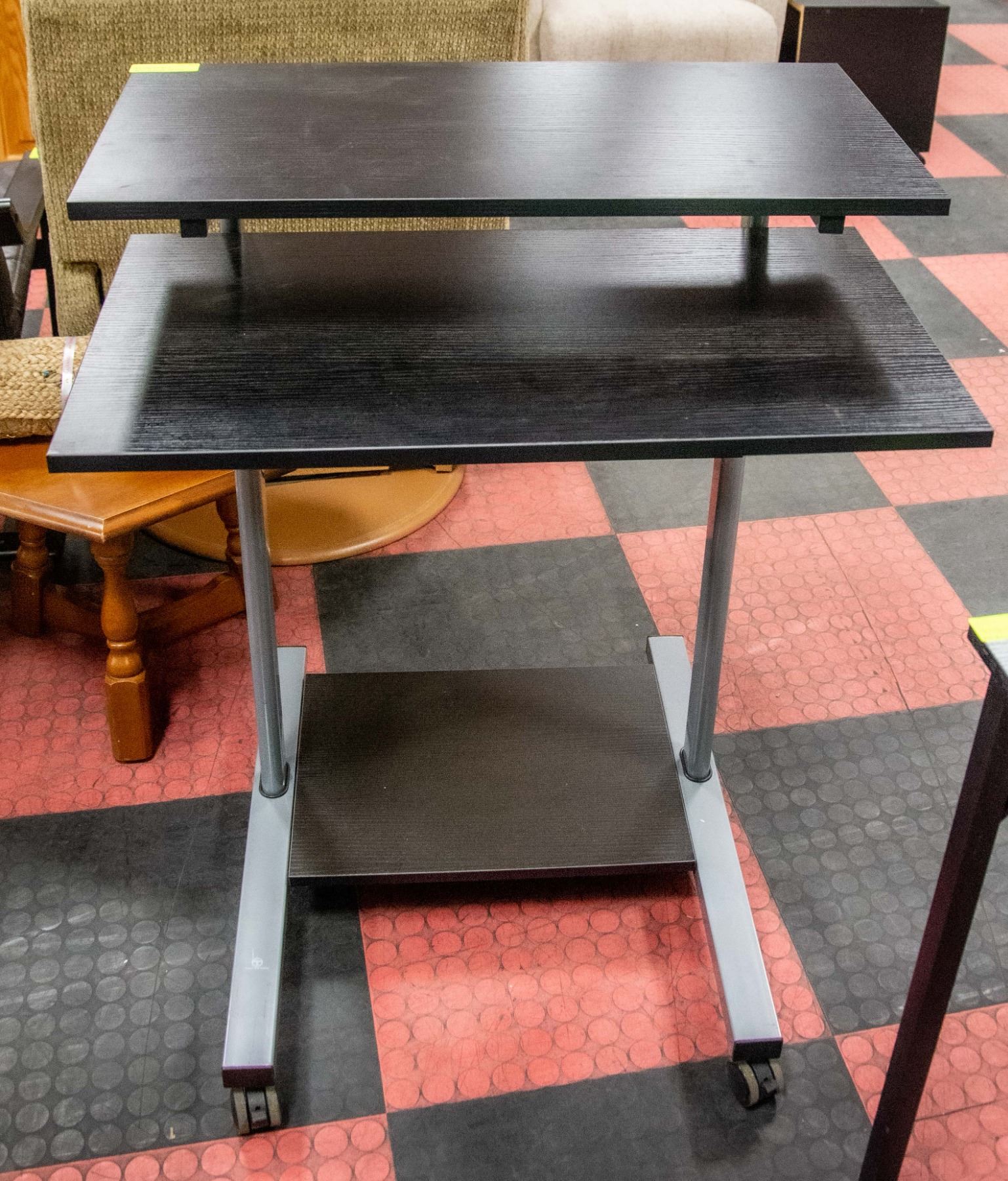 NEWLY ASSEMBLED HEIGHT ADJUSTABLE BLACK DESK/RISER APPROXIMATELY 27.5" WIDE, MULTIPLE SHELVES, LOCKI