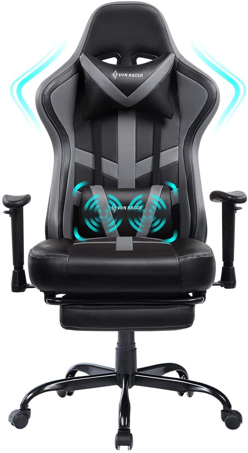 WITH BUILT IN MASSAGE PILLOW, ERGONOMIC DESIGN, EXECUTIVE STYLE CHAIR, FULL ADJUSTMENT, FULL SWIVEL, BONDED LEATHER, HEADREST, FOOTREST, ADJUSTABLE ARM RESTS, GREY, TESTED, ALL PARTS CONFIRMED, INSTRUCTION MANUAL INCLUDED, AMZ SES