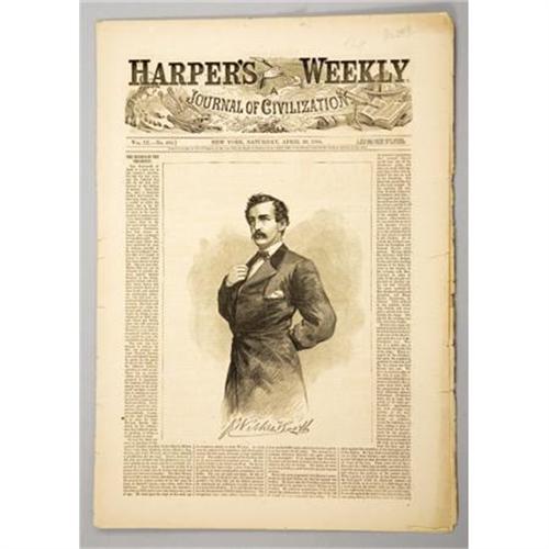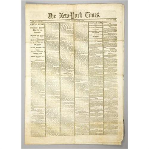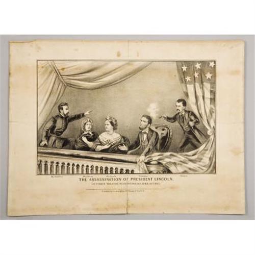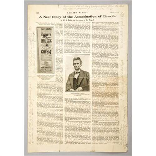 <B><I>NEW-YORK TIMES</B></I></B></I><B> NEWSPAPER APRIL 15, 1865,</B></I><B><I> "</B></I></B></I><B>PRESIDENT LINCOLN SHOT BY AN ASSASSIN THE DEED DONE AT FORD’S THEATRE LAST NIGHT." ALSO NUMEROUS OTHER LINCOLN ITEMS CIRCA 1861-1865.</B></I> This lot has numerous items about President Lincoln: <B><I>Currier & Ives</B></I></B></I><B> "</B></I>The Assassination of President Lincoln", 16" x 12”; <B>Complete </B></I><B><I>Harper’s Weekly </B></I></B></I>with ¾ length etching of John Wilkes Booth; <B>Broadside</B></I>, the Olive Branch: "<I>Peace and Union. How shall we obtain them?" </B></I>, 12” x 17.5”; <B><I>Leslie’s Weekly </B></I></B></I>a new story of the Assassination of Lincoln, March 26, 1908, have notations by Fostell on paper. <B><I>National Police Gazette</B></I></B></I><B>-</B></I> April 22, 1865. Etchings of Death Bed of Lincoln & the Assassination. <B><I>Philadelphia Inquirer</B></I></B></I><I> </B></I>17 April 1865. <B><I>New York Herald </B></I></B></I>15 April 1865 Assassination of Lincoln, J. W. Booth alleged Assassin. <B>Extra:</B></I> Death of President. <B><I>New York Tribune </B></I></B></I>28 April 1865. <B><I>New York Herald </B></I></B></I>9 November 1864 Abe Lincoln Re-Elected President. <B><I>New York Tribune </B></I></B></I>April 17, 1865. Scene of tragedy & John Wilkes Booth the Assassin etchings . <B>Broadside</B></I>: The Inaugural Address 4 march 1865 laminated . <B><I>Philadelphia Inquirer </B></I></B></I>20 April 1865 The funeral car of President Lincoln. <B><I>Harpers Weekly</B></I></B></I><B> </B></I> with etching of wearing Wide Awake hats, Oct. 3, 1860. Very nice archive. 24-plus items. <BR><BR><B>Provenance: </B></I><I>Al. Emmett Fostell Collection</B></I><B><I> </B></I></B></I><BR><BR><B>Condition:</B></I> Various conditions - good-very fine.<BR><BR><b>Shipping:</b> Miscellaneous Collectibles, Smal (<a target="_blank" href="http://www.heritageauctions.com/common/shipping.php">view shipping information</a>)