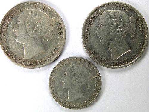 1894 Obverse 1 and 2, F-VF. Plus Ten Cents 1890, VF. Three pale golden toned pieces