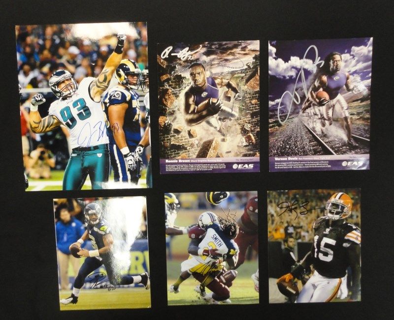 11x14 AUTO JASON BABIN PHOTO, VERON DAVIE, RONNIE BROWN AUTO PHOTOS, 14- 8x10 AUTO NFL PHOTO'S, SPORTS ILLUSTRATED AUTOGRAPHED COVER, 3- SUPER BOWL MAGAZINES PLUS POSTERS AND MORE, GREAT MAN CAVE LOT, EST $170-$200