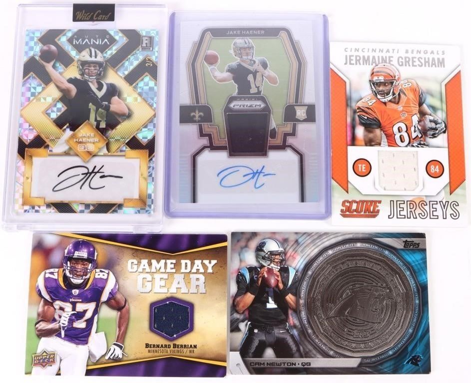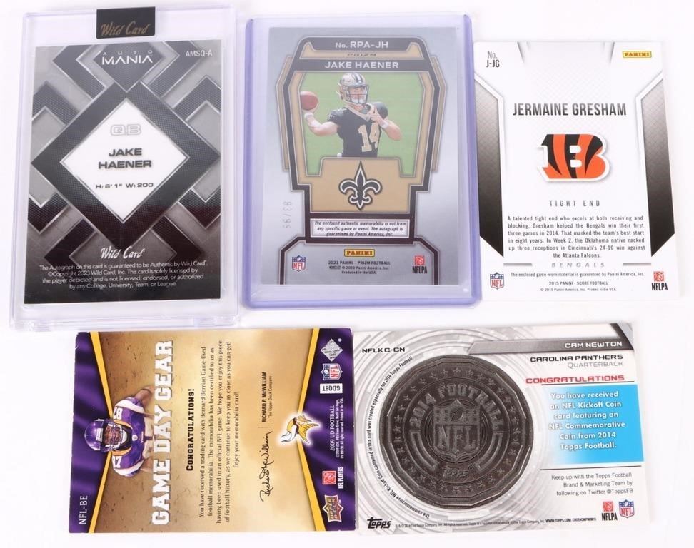 2023 Wild Card AutoMANIA Jake Haener (Rookie) Autographed, 2009 Upper Deck GameDay Gear Bernerda Berrian Jersey Card, 2015 Panini Score Jermaine Gresham Jersey Card, 2014 Topps Commemorative NFL Kickoff Cam Newton Card, & 2023 Panini Prizm Jake Haener (Rookie) Auto. & Jersey.