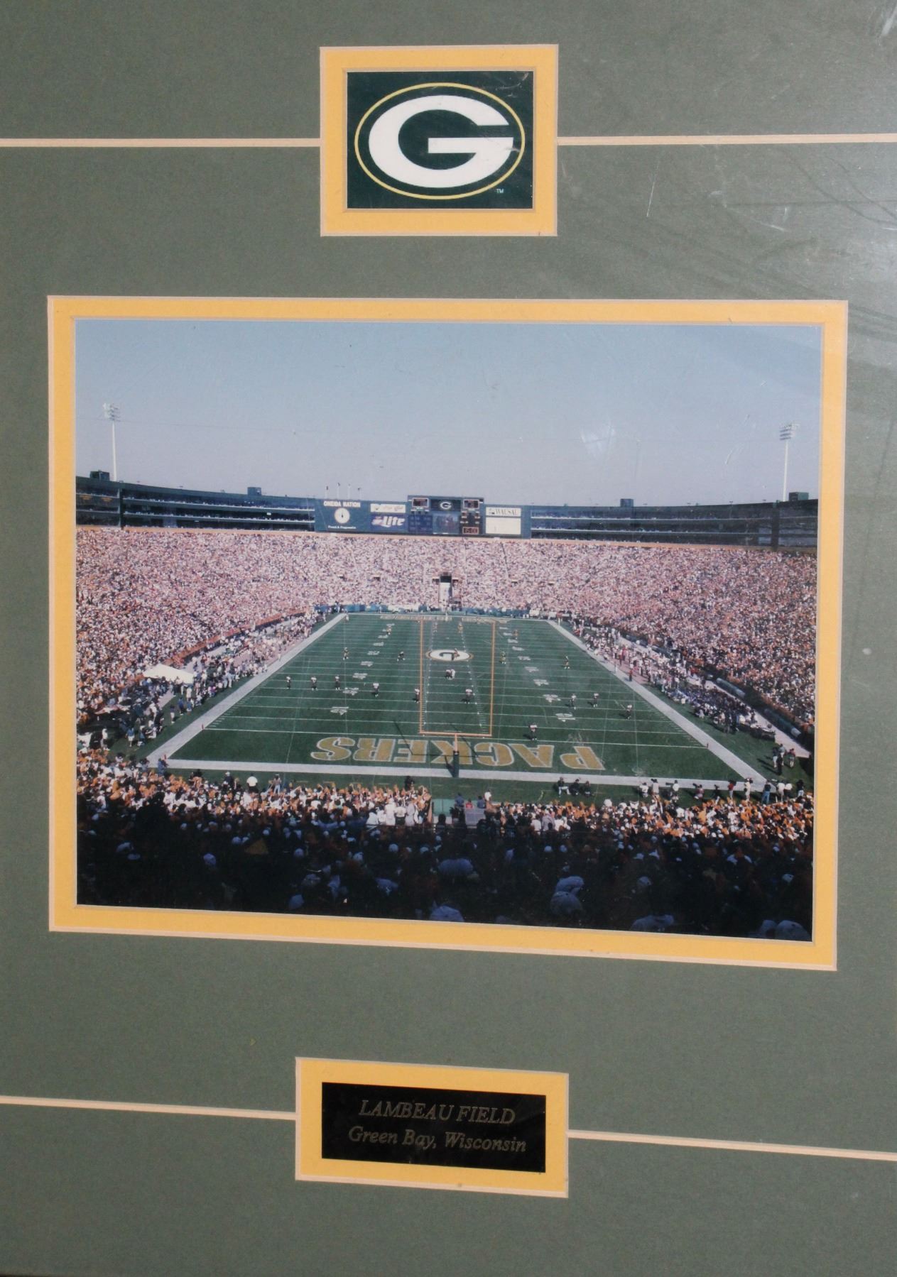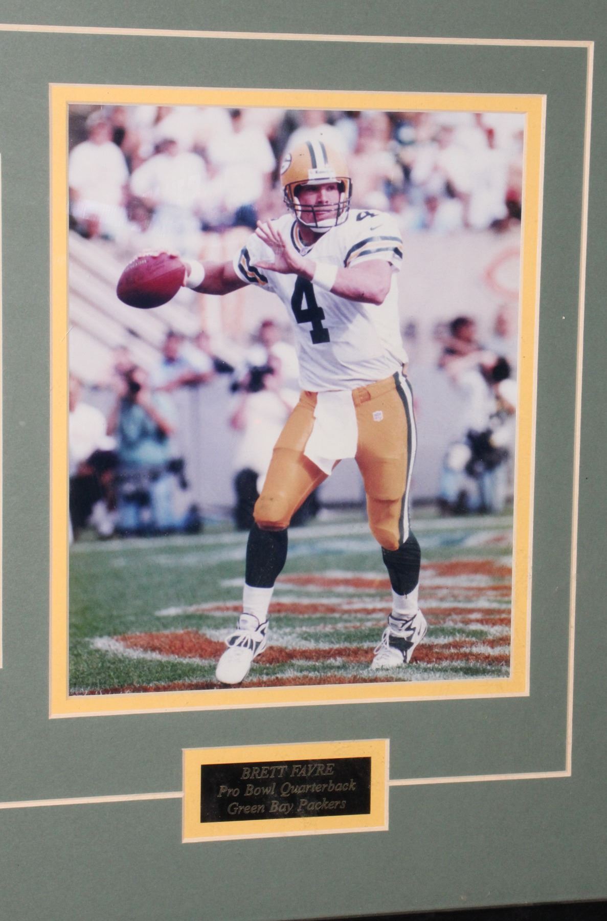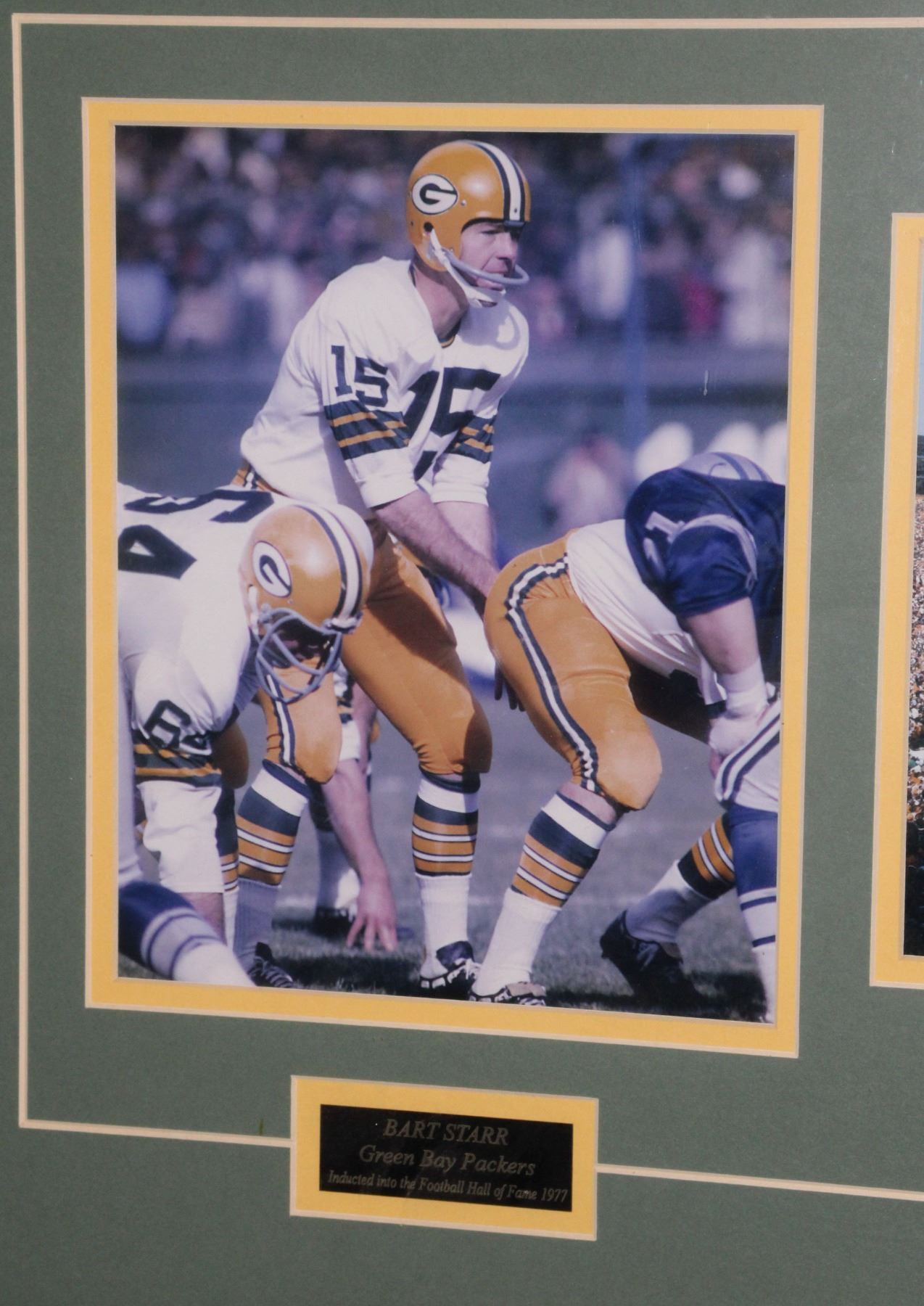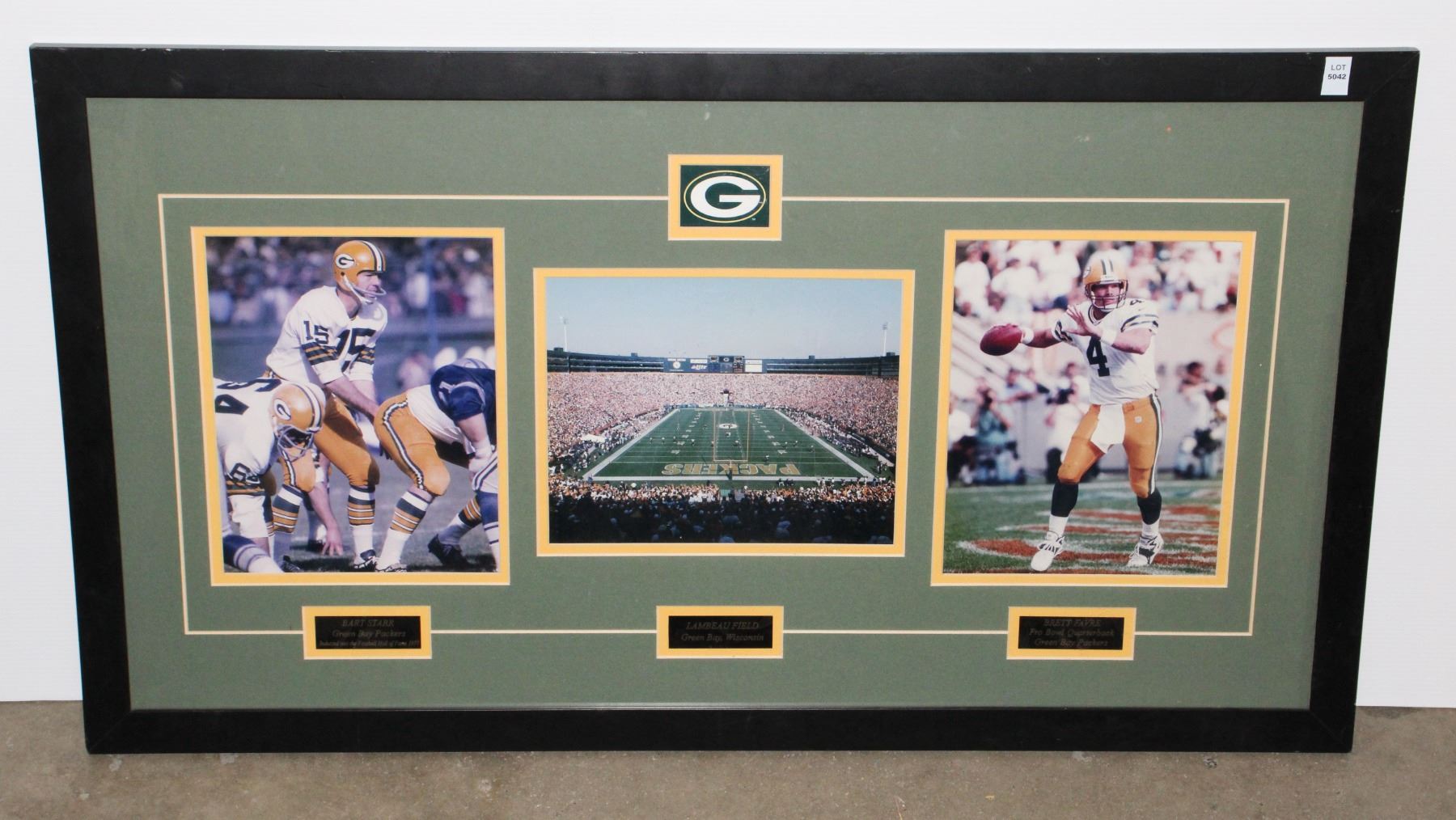 THREE 8X10 IMAGES BRETT FAVRE, BART STARR & LAMBEAU FIELD. CUSTOM FRAMED SIZE 36"X20" DESCRIPTIVE ENGRAVED PLAQUES