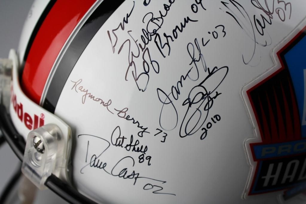 This awesome piece of historic memorabilia is a Pro-Line helmet with the NFL Hall of Fame logo on both sides and it is signed by 48 of the biggest names ever to play pro football. This helmet does not contain "2nd tier" players!!! This helmet comes with a full letter of authenticity from PSA/DNA the leading name in autograph authentication. Just look at the names on this helmet!Joe Montana,Troy Aikman,Emmitt Smith,Dan Marino,Jerry Rice,Warren Moon,Dan Fouts,Jim Brown,Bob Griese,Don Shula,Gale Sayers,Fred Biletnikoff,Dick Butkus,Ronnie Lott,Steve Largent,Jack Ham,Len Dawson and so much more!Get this unique piece of NFL memorabilia today!
