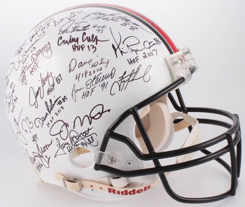 Riddell Hall of Fame full-size authentic on-field helmet. Hand-signed in black felt-tip pen by Mel Renfro, Jerry Rice, Joe Montana, Warren Sapp, Deion Sanders, Warren Moon, Lawrence Taylor, Dave Robinson, Jack Ham, Bob Lilly, Jim Otto, Len Dawson, Jim Taylor, Randy White, Bart Starr, Jack Youngblood, Steve Largent, Rayfield Wright, Frank Gifford, Paul Hornung, Willie Roaf, Rod Woodson, Lem Barney, and 16 others.