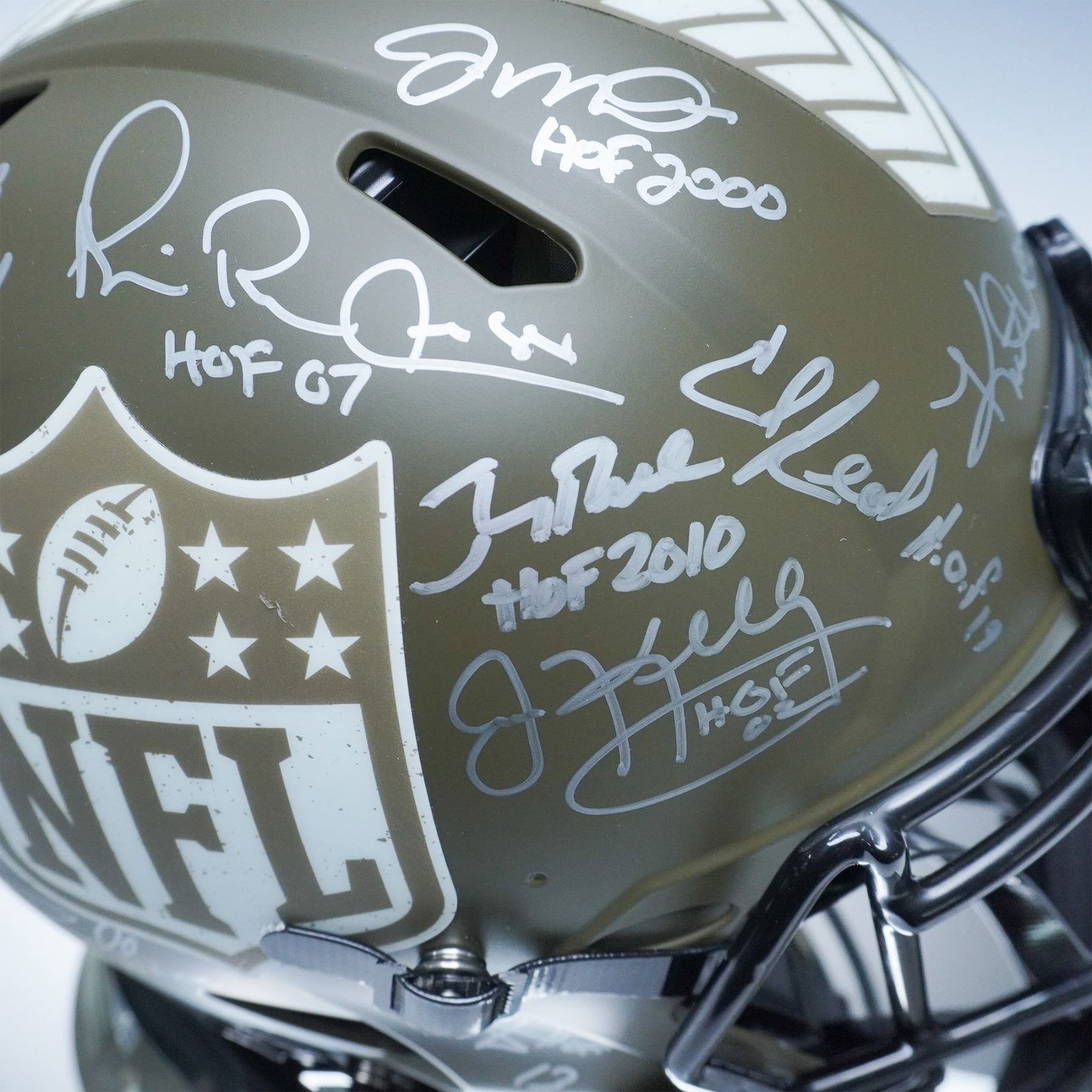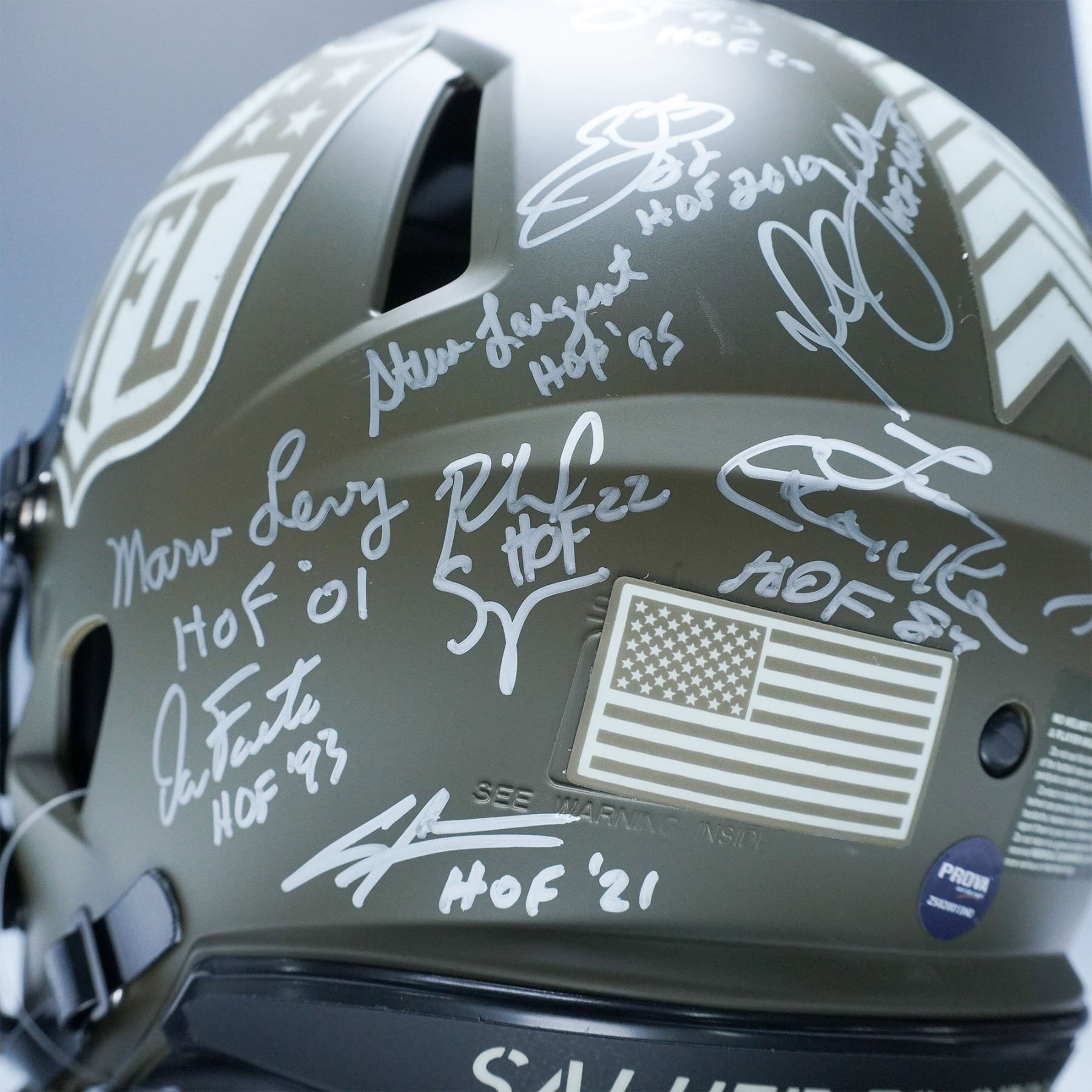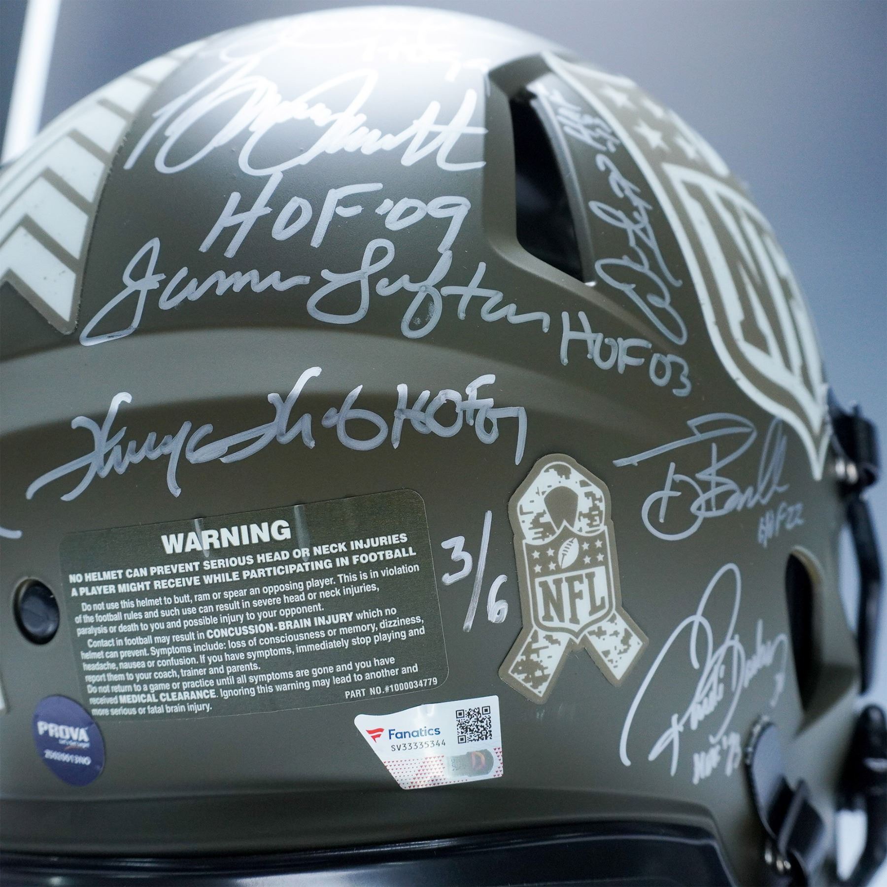 This extraordinary Riddell NFL Shield 2022 Salute to Service Speed Authentic Helmet is a collector’s dream, featuring 32 signatures from legendary Hall of Fame inductees. Adorned with the signatures of football greats including Joe Montana, Jerry Rice, Dan Marino, Ray Lewis, Barry Sanders, and many more, this limited-edition helmet (3 of 6) is a rare piece of NFL history. The autographs, inscribed in bold silver ink, include multiple "HOF" inscriptions, celebrating the legacy of these gridiron icons. Officially authenticated by Fanatics, this helmet is beautifully displayed in a protective case, making it a remarkable centerpiece for any sports memorabilia collection.