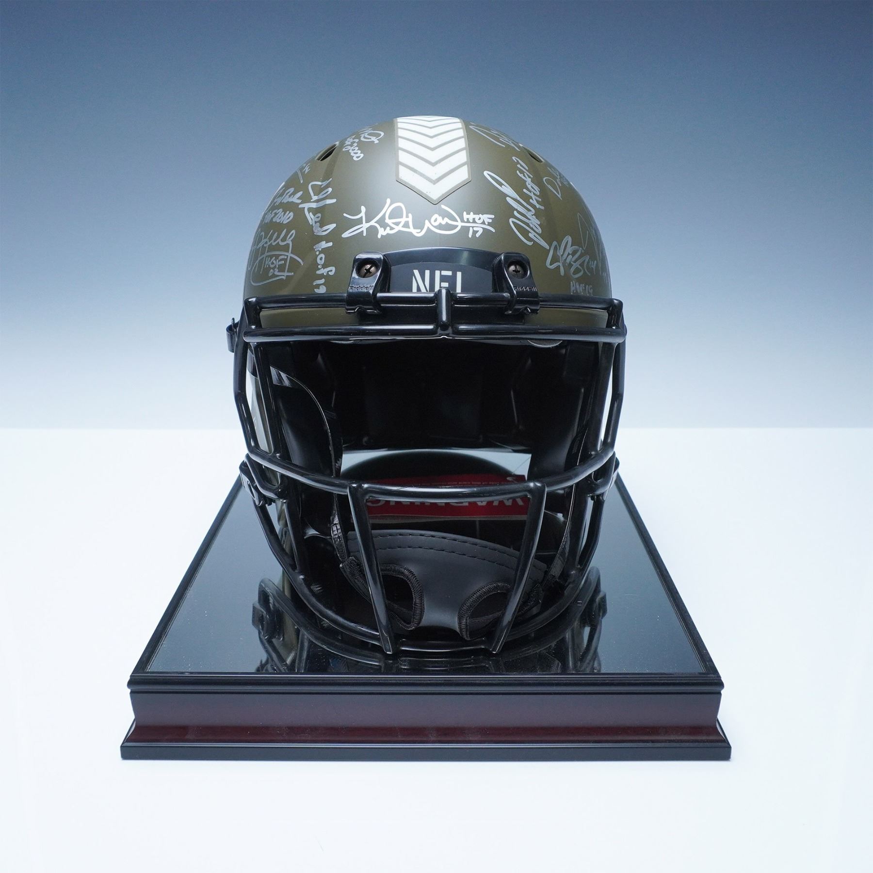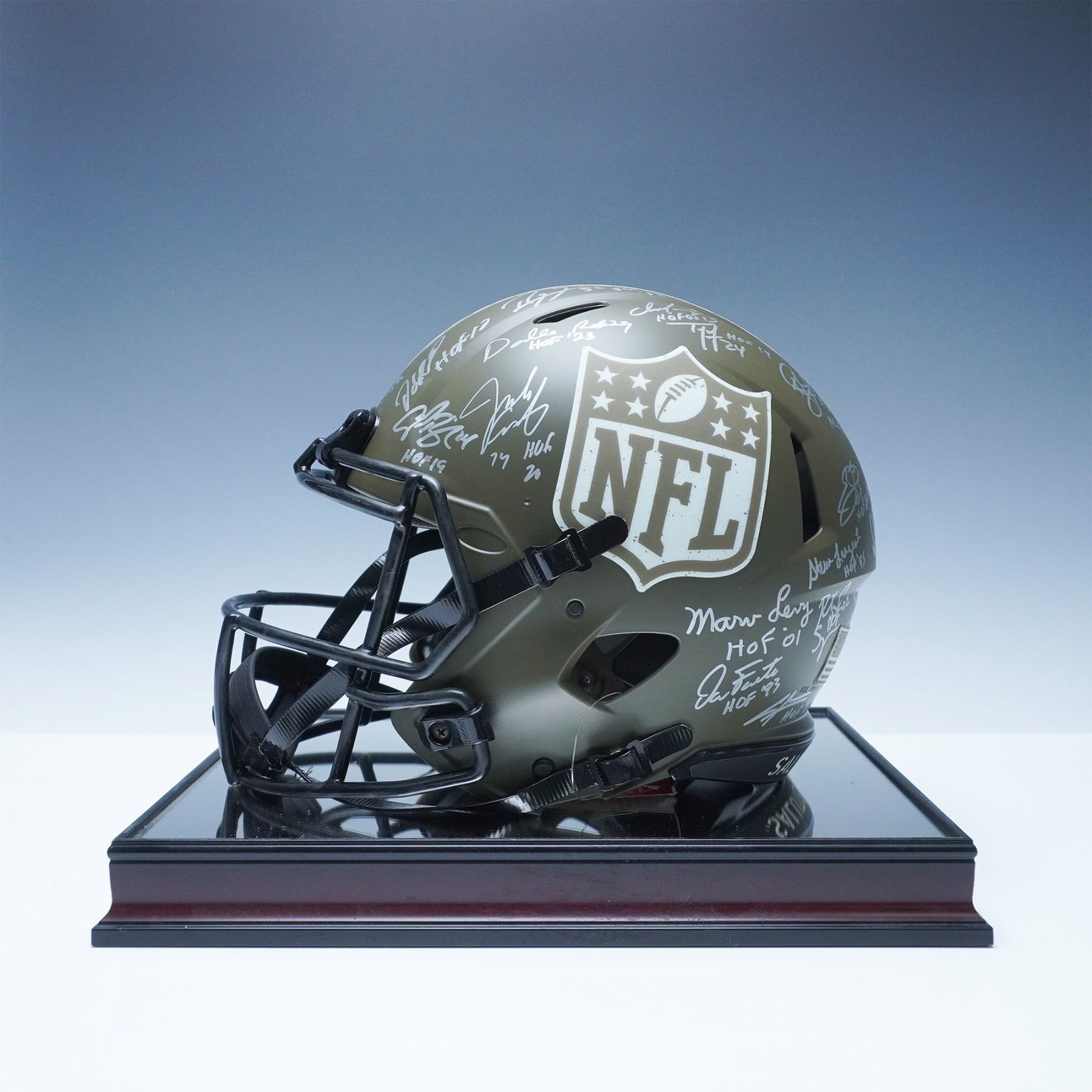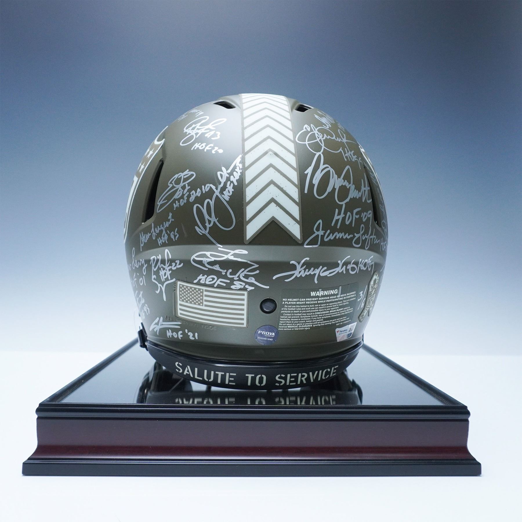 This extraordinary Riddell NFL Shield 2022 Salute to Service Speed Authentic Helmet is a collector’s dream, featuring 32 signatures from legendary Hall of Fame inductees. Adorned with the signatures of football greats including Joe Montana, Jerry Rice, Dan Marino, Ray Lewis, Barry Sanders, and many more, this limited-edition helmet (3 of 6) is a rare piece of NFL history. The autographs, inscribed in bold silver ink, include multiple "HOF" inscriptions, celebrating the legacy of these gridiron icons. Officially authenticated by Fanatics, this helmet is beautifully displayed in a protective case, making it a remarkable centerpiece for any sports memorabilia collection.