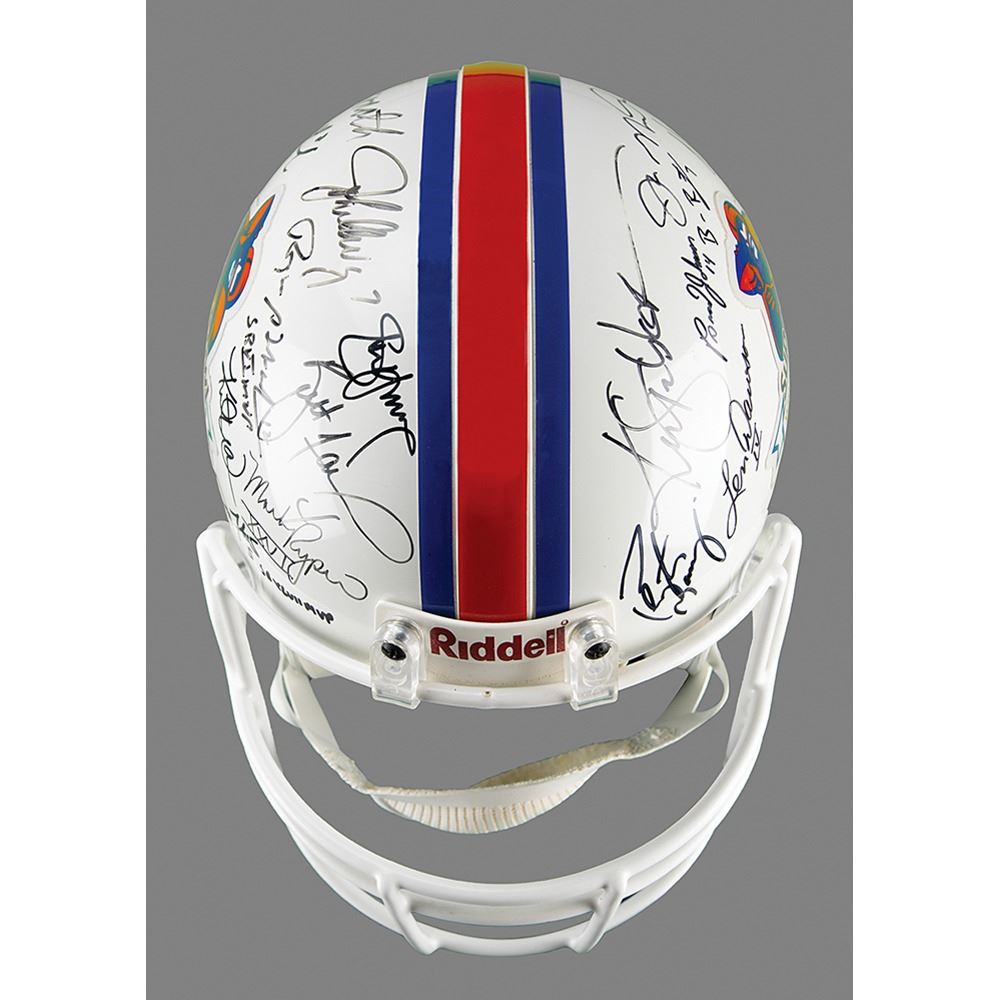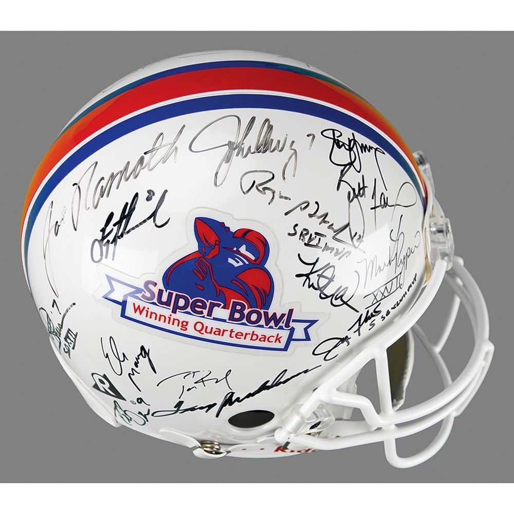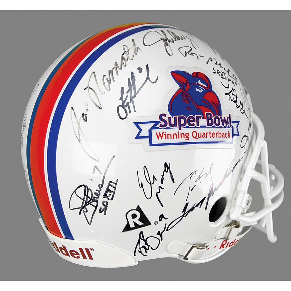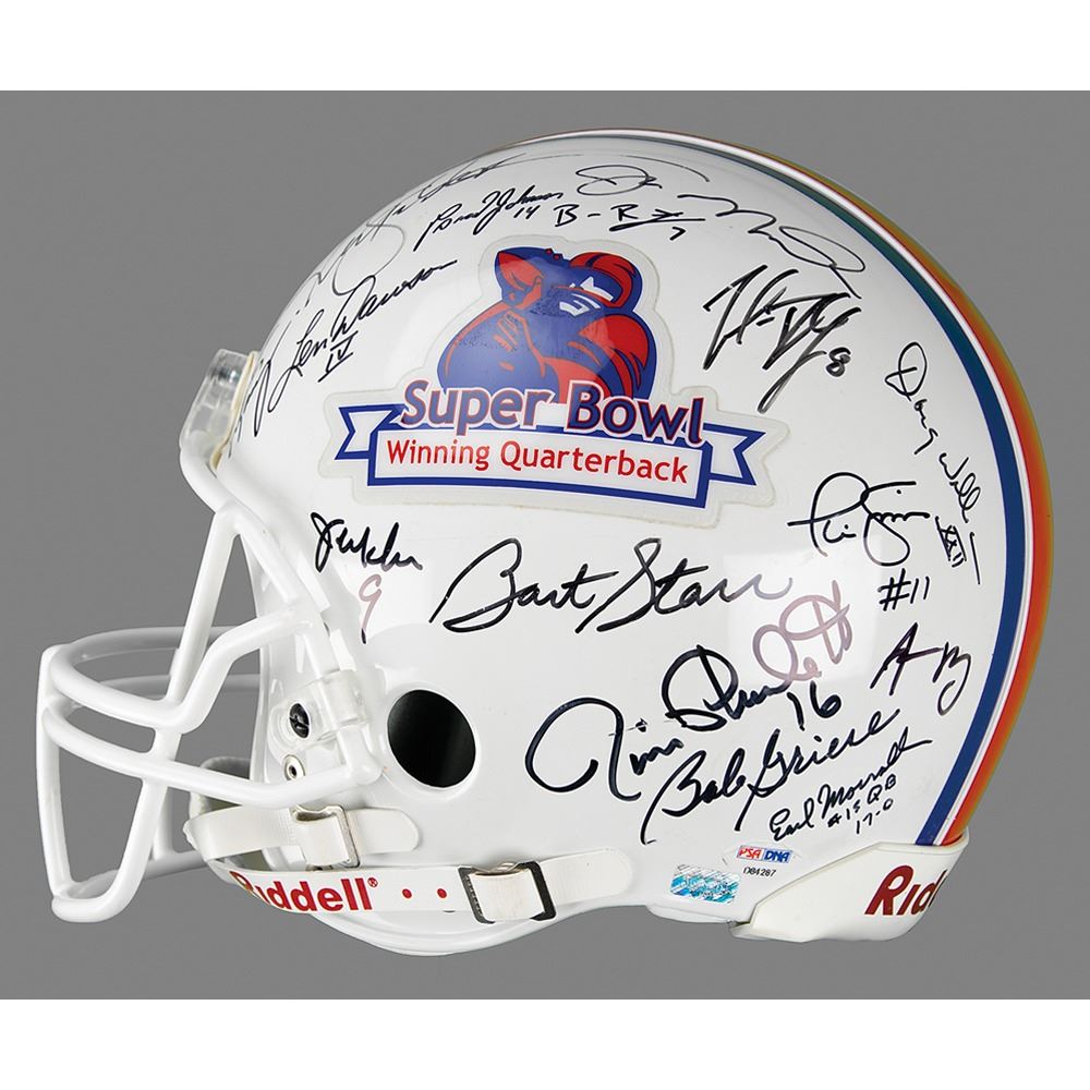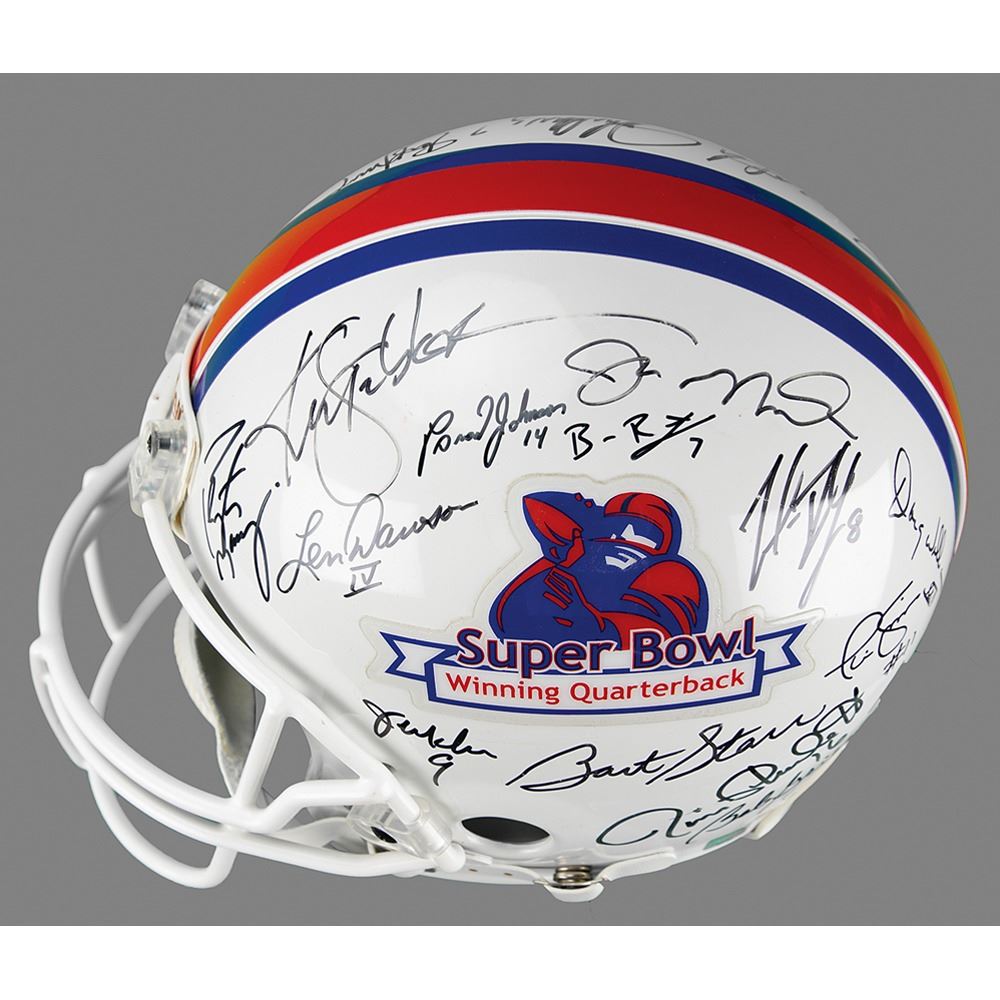 Signers include: Troy Aikman (Super Bowls 27, 28, 30), Terry Bradshaw (9, 10, 13, 14), Tom Brady (36, 38, 39, 49, 51, 53, 55), Drew Brees (44), Len Dawson (4), Trent Dilfer (35), John Elway (32, 33), Brett Favre (31), Joe Flacco (47), Bob Griese (7, 8), Brad Johnson (37), Eli Manning (42, 46), Peyton Manning (41, 50), Jim McMahon (20), Joe Montana (16, 19, 23, 24), Earl Morrall (5), Joe Namath (3), Jim Plunkett (15, 18), Aaron Rodgers (45), Ben Roethlisberger (40, 43), Mark Rypien (26), Phil Simms (21), Ken Stabler (11), Bart Starr (1, 2), Roger Staubach (6, 12), Joe Theismann (17), Kurt Warner (34), Doug Williams (22), and Steve Young (29). In fine condition, with small scuffs to Brady and Namath, and two authenticity labels affixed to lower backside of the helmet. Accompanied by a full letter of authenticity from PSA/DNA. The consignor notes that the helmet was specially produced in a limited issue.