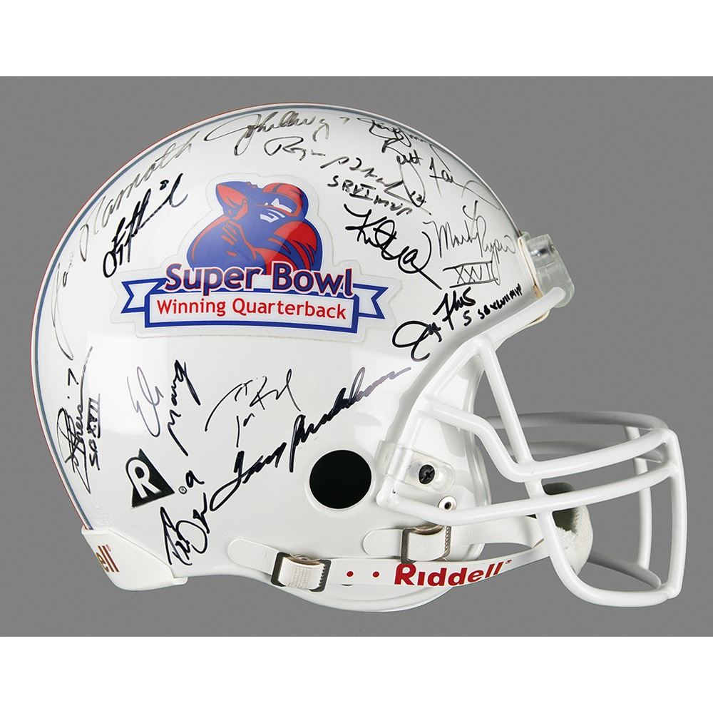 Very rare official Riddell Authentic VSR-4 football helmet, with central red and blue stripes and custom-designed “Super Bowl Winning Quarterback” decals to either side, both of which are signed in black felt tip by 29 of the 33 quarterbacks that have won the NFL Championship Game.