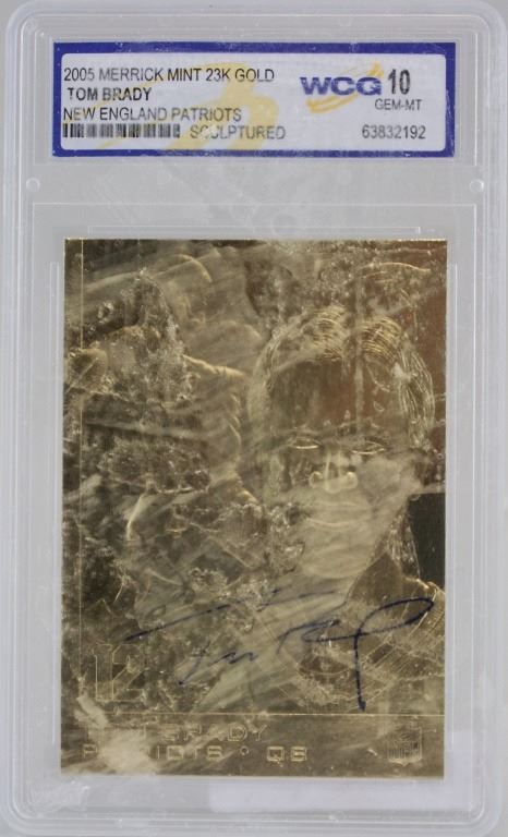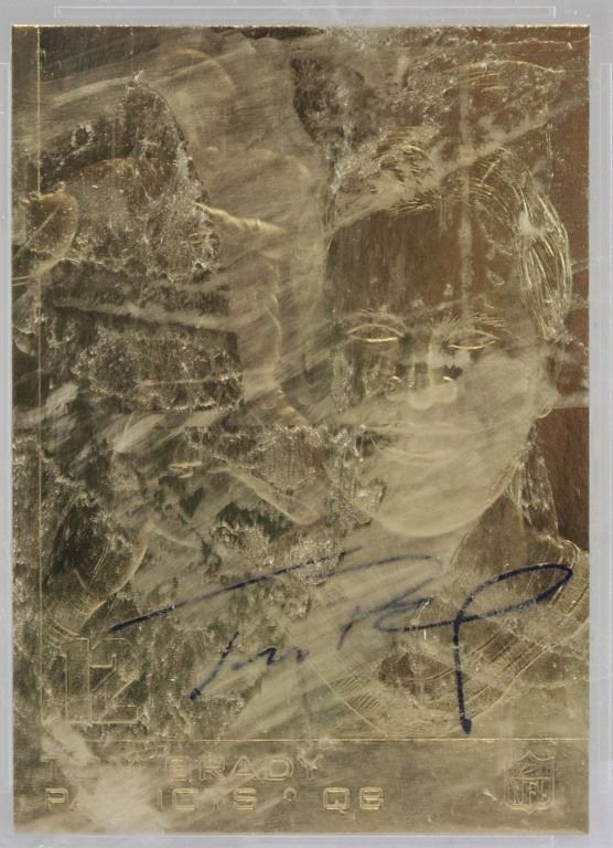 2005 Merrick Mint 23k Gold plaque, stamped with Tom Brady's image. Signed to the bottom right on front.