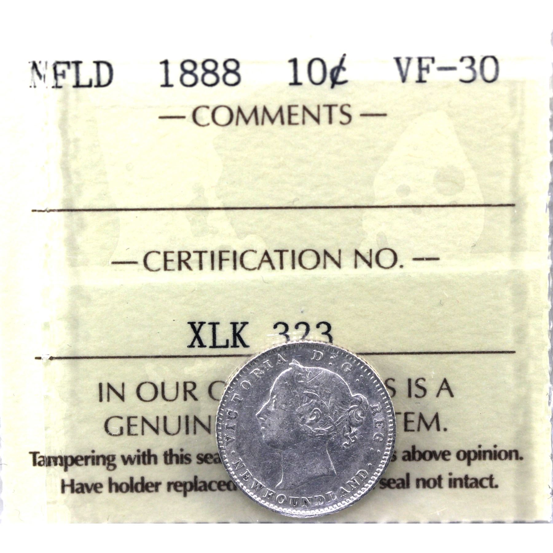 NFLD 10-cent 1888 ICCS Certified VF30. Bright Coin with Traces of Mint Lustre Throughout