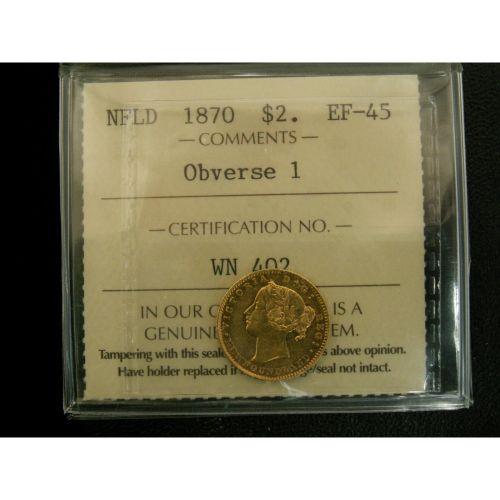 NFLD 1870 $2 Obv 1 ICCS EF45, A nice coin with light lustre