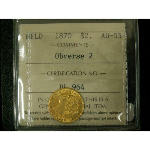 NFLD 1870 $2 Obv 2 ICCS AU55. Strongly struck and lustrous.