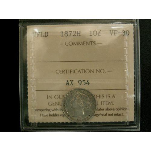 NFLD 1872H 10¢ ICCS VF30, a nice coin with light lustre around the rim