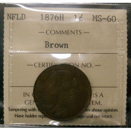 NFLD 1876H 1¢ ICCS MS-60, nice chocolate brown example. Scarce in this designation